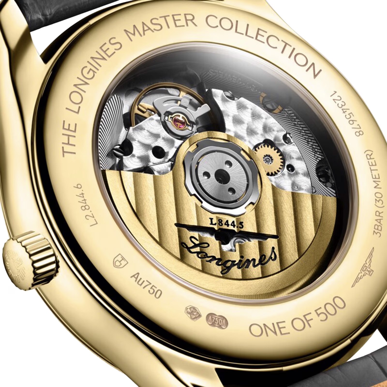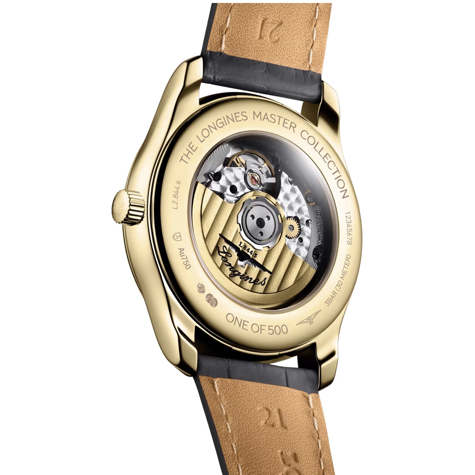 The model is driven by an exclusive Longines L844.5 calibre equipped with a silicon balance-spring and innovative components, offering a magnetic resistance ten times greater than the ISO 764 benchmark standard. This self-winding mechanical movement is visible through the transparent sapphire case back of the 40 mm-diameter case and offers a power reserve of up to 72 hours.