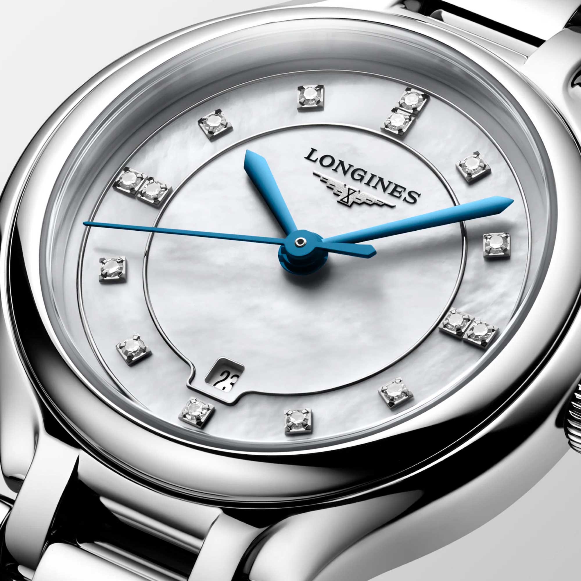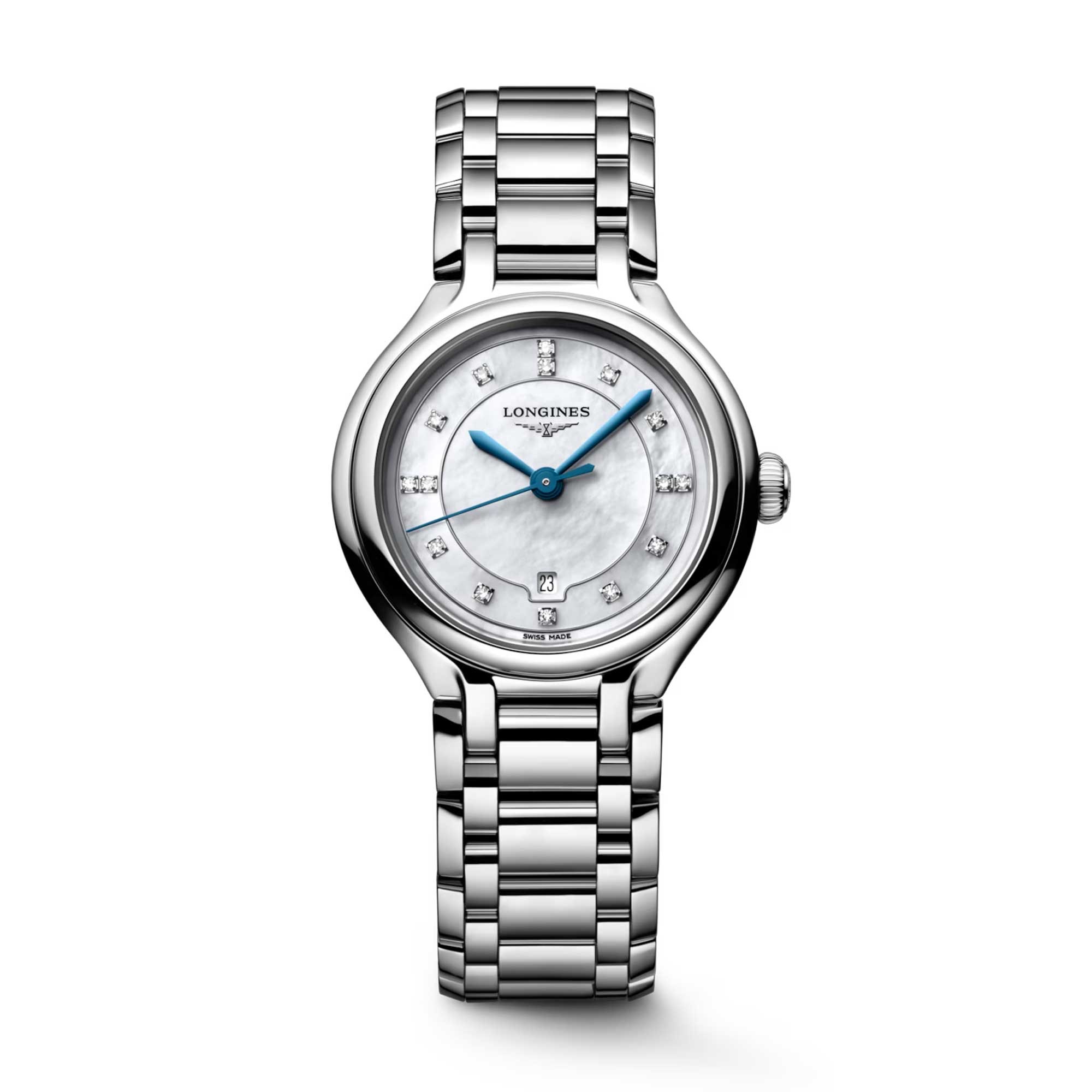 This Longines PrimaLuna L8.142.4.87.6 brings a clean, modern take to a classic round profile. Its 30mm stainless steel case frames a white mother-of-pearl dial with blued steel hands and diamond indexes. The dial is set with 15 Top Wesselton VS–SI diamonds, totalling 0.057 carats, giving precise, easy-to-read markers with a refined sparkle. A stainless steel bracelet completes the look and secures with a triple safety folding clasp and push‑piece opening mechanism.