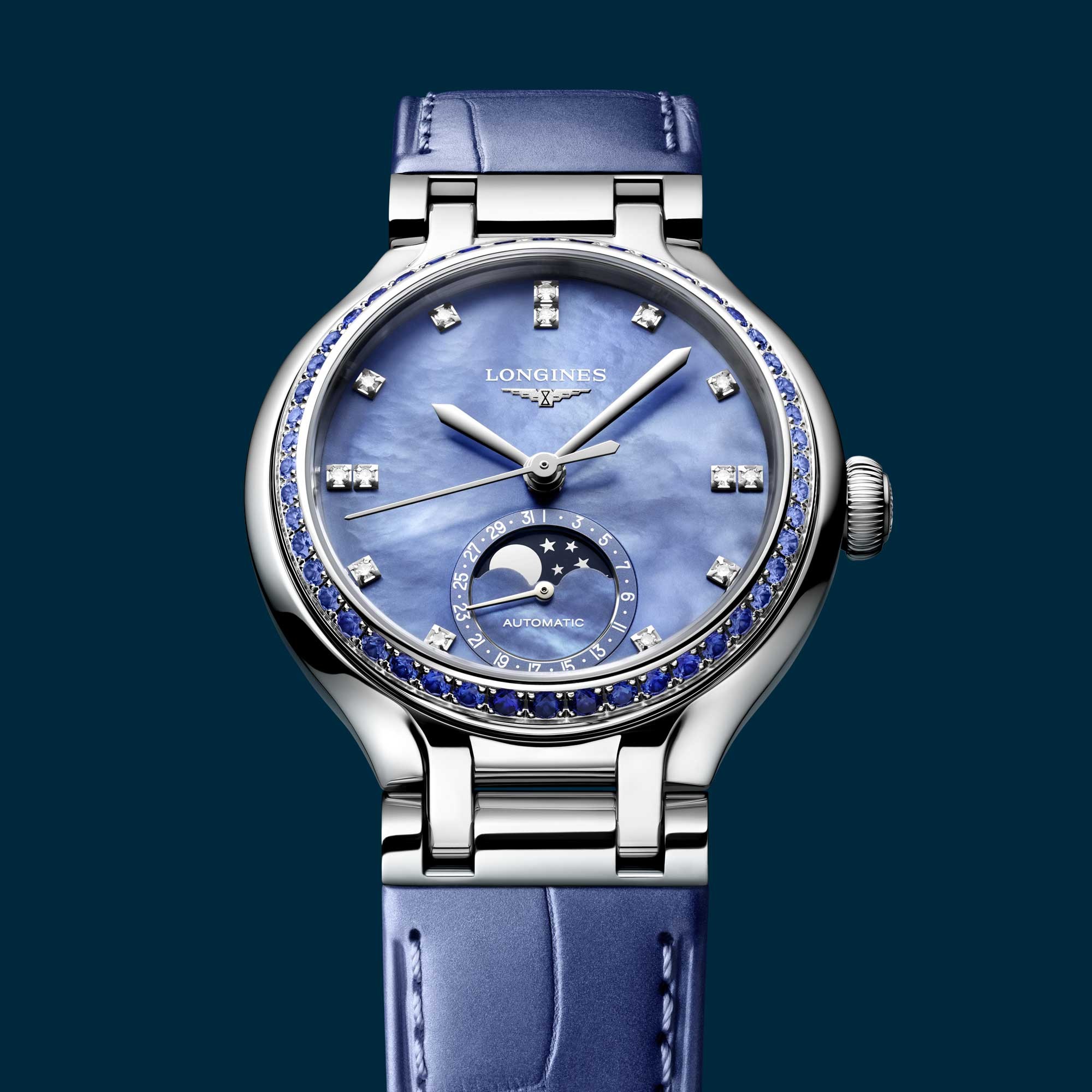 The Longines PrimaLuna Moonphase 34mm Ladies Watch L8.126.0.97.2 presents an exquisite blend of elegance and functionality. Powered by an automatic movement, this watch performs with precision, operating at 25,200 vibrations per hour. The beautiful blue dial is accented with 14 Top Wesselton diamonds, totalling 0.060 carats.