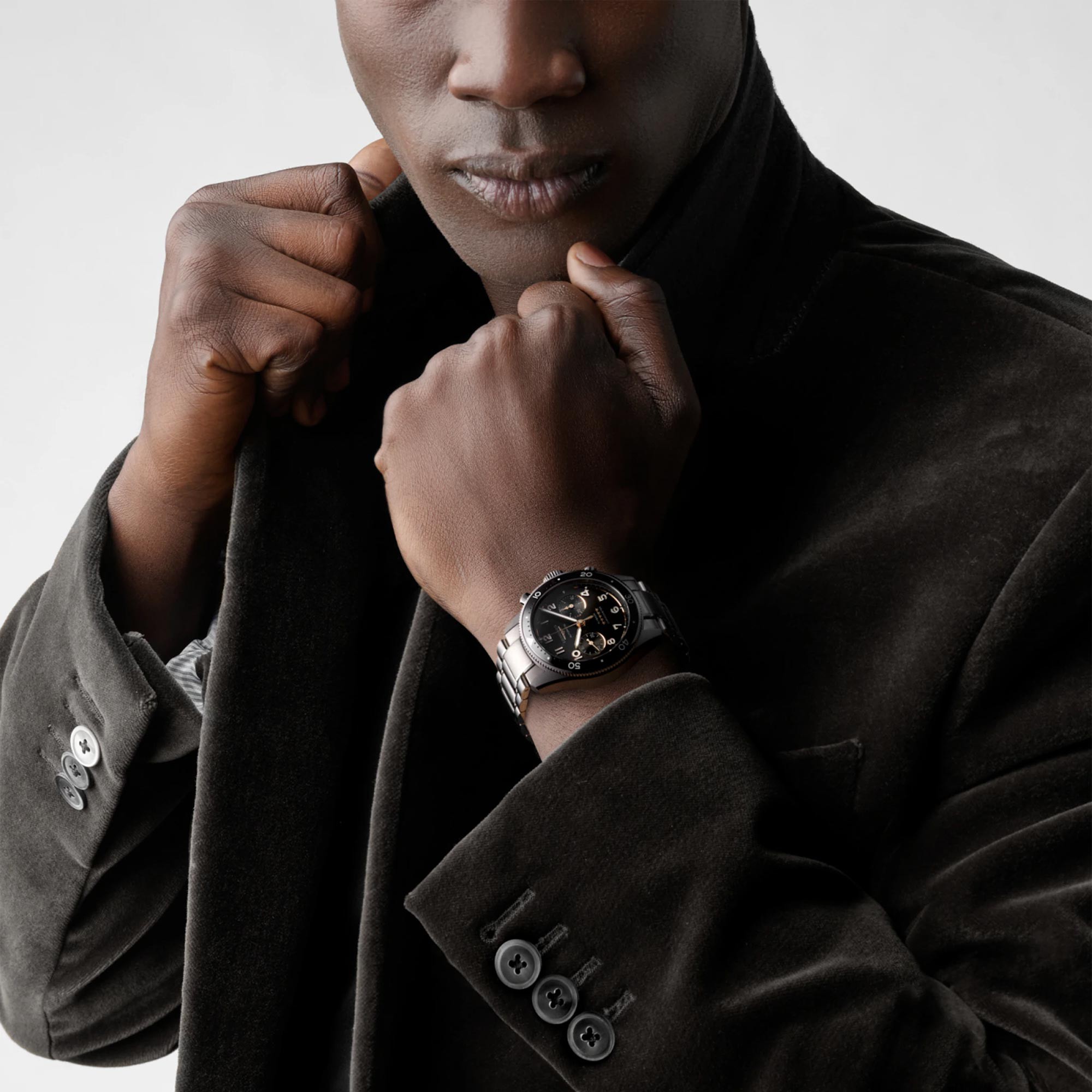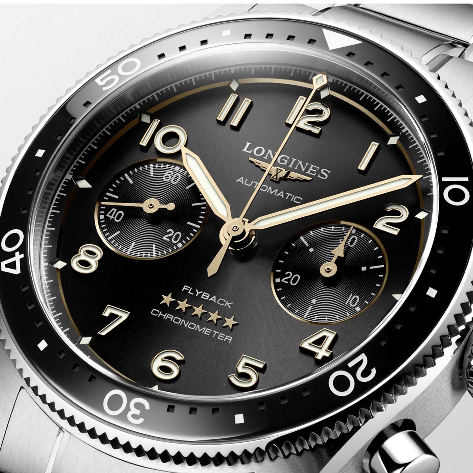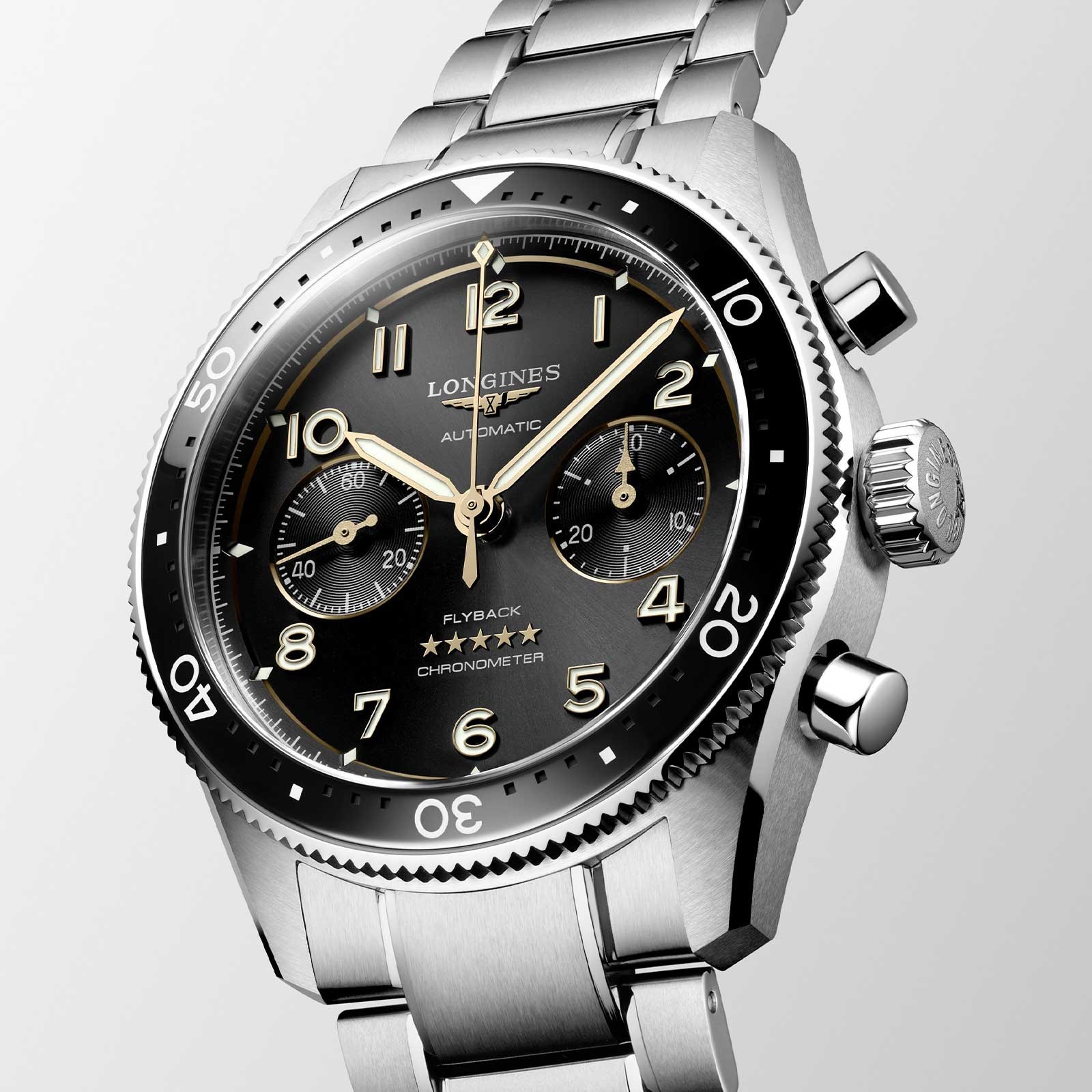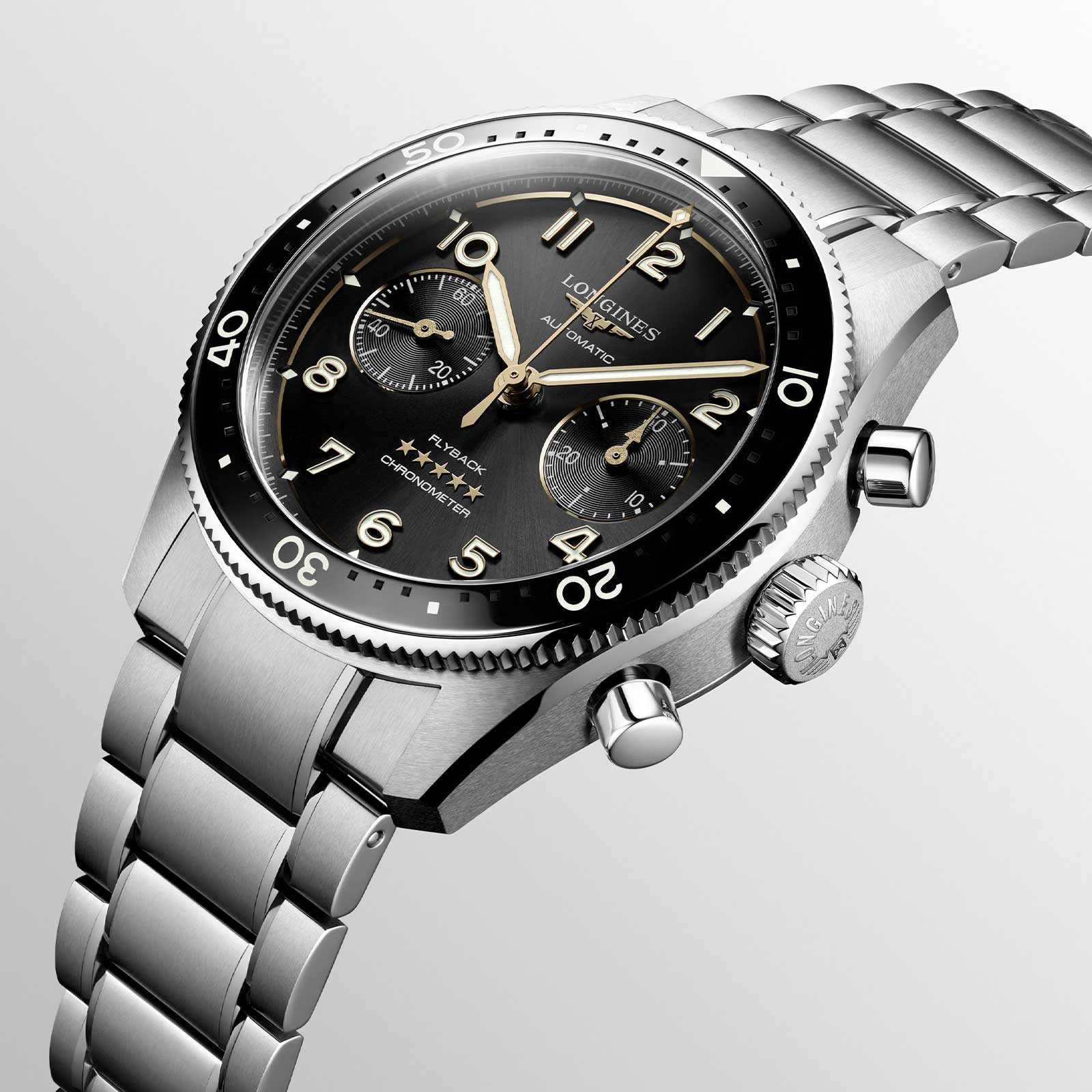 The Longines Spirit collection has been expanded with a piece equipped with a flyback function. A new exclusive Longines calibre, resistant to magnetism and equipped with a silicon balance spring, drives this timepiece. Extremely precise, and with a power reserve of 68 hours, this movement is certified as a chronometer by COSC. A transparent case back reveals all the details of the calibre, including a personalised weight engraved with the globe representing the Longines Spirit collection and the name Longines Flyback. This new model is also distinguished by its refined aesthetics and particularly meticulous finishes, which range between stain, matt, polished and engraved details. It features a bi-directional bezel enhanced by a black ceramic insert with luminescent markers and a black sunray dial. The 42mm steel case has an interchangeable stainless steel bracelet.