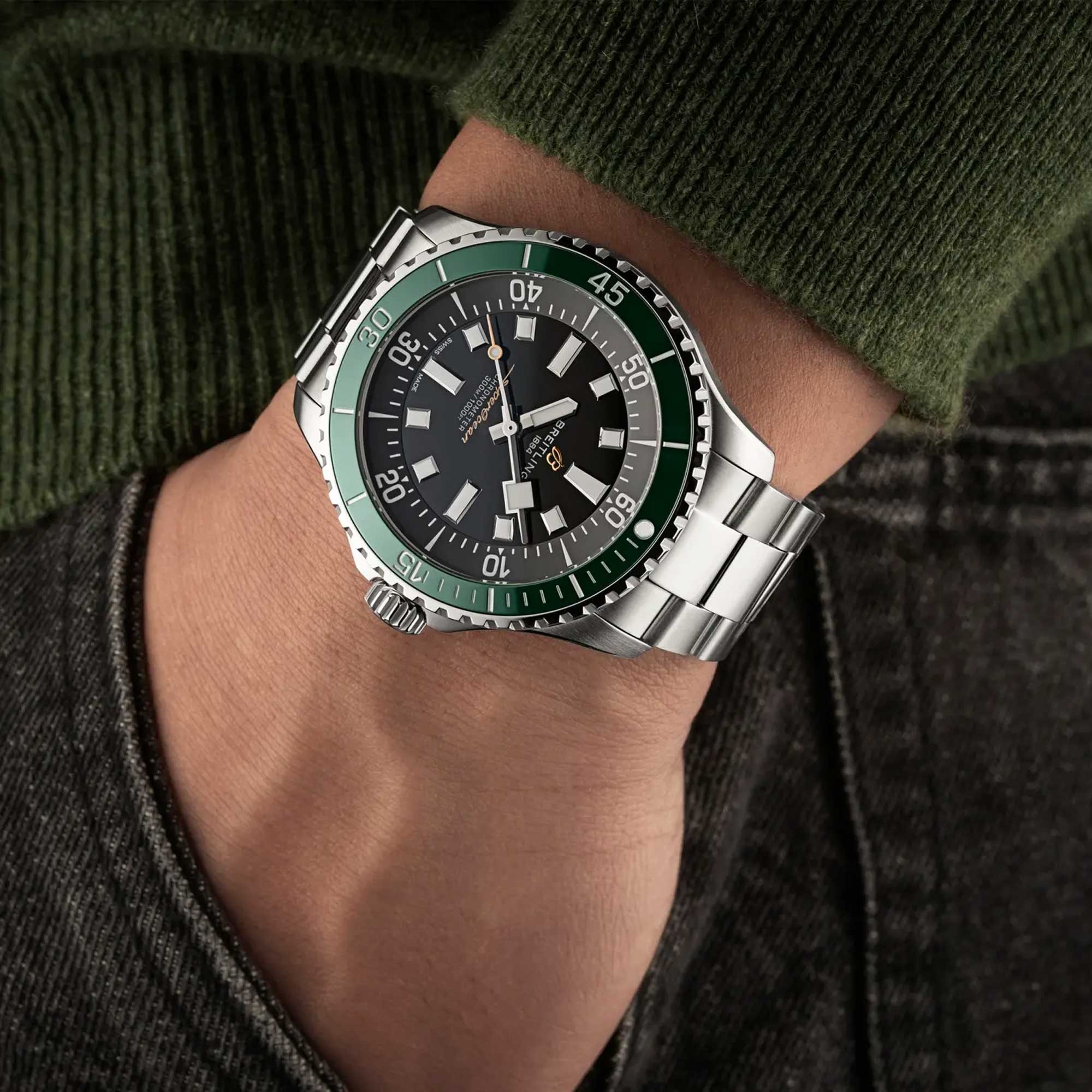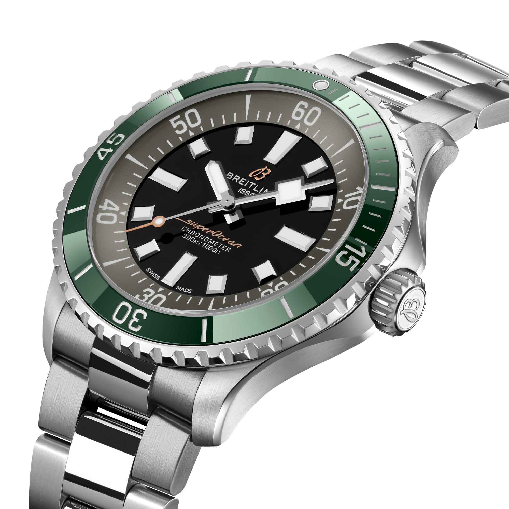 The new Superocean retraces those celebrated design codes while introducing modern engineering and a distinctive limited-edition design. A deep-green ceramic bezel is paired with an anthracite rehaut and black dial, creating a sharp, high-contrast aesthetic designed for absolute clarity. The ceramic inlay offers lasting colour and scratch resistance, while broad Super-LumiNova® hands and indexes ensure exceptional legibility in any light.