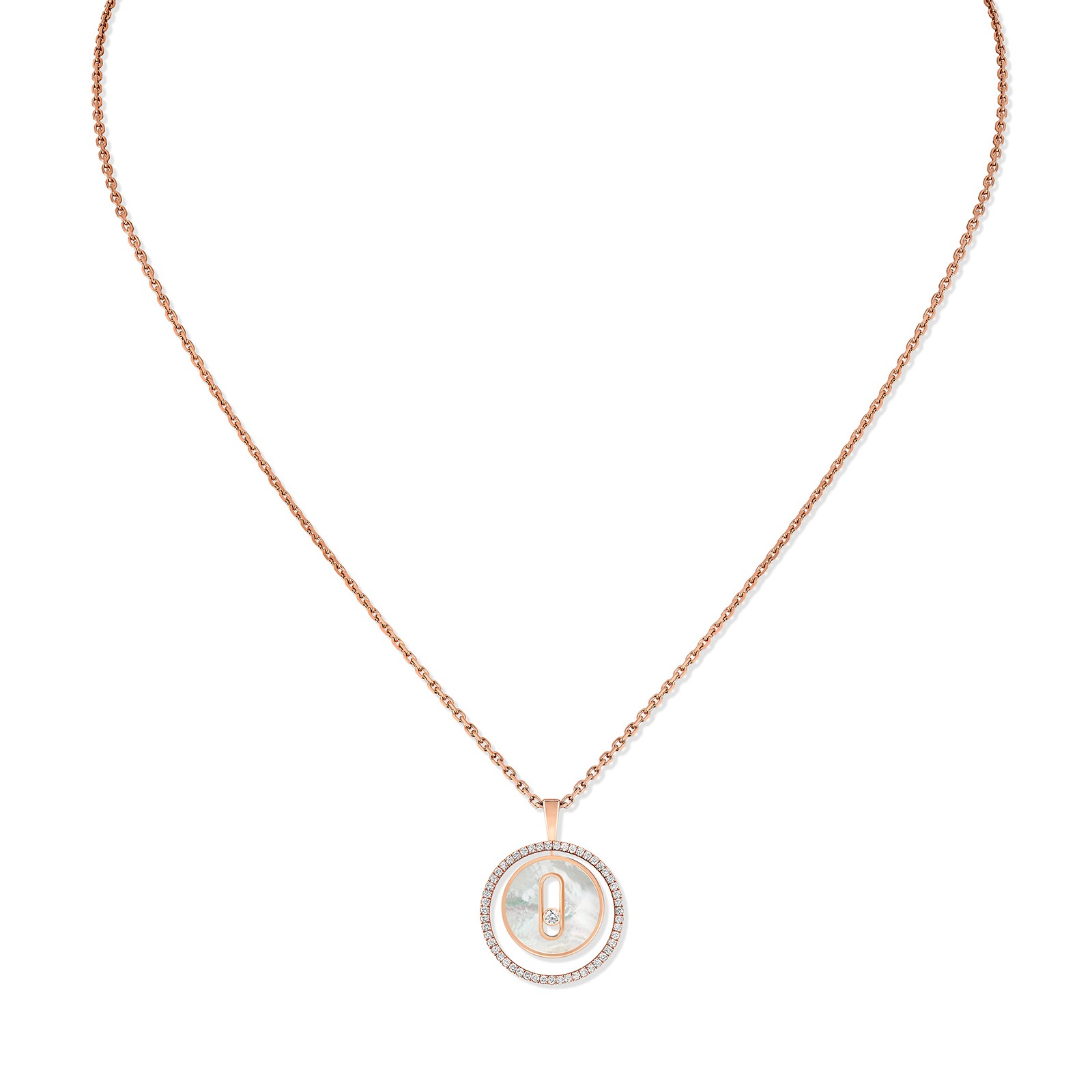 Be seduced by the Lucky Move necklace in rose gold, diamond and white mother-of-pearl. Inspired by talisman jewellery pieces, the Lucky Move Jewellery collection features ornamental stones for a colourful touch that is just as unique as your personality. Produced naturally inside certain shells, white mother-of-pearl captivates with its subtle iridescent reflections. A groove in the centre holds a diamond in place which symbolises freedom. The medallion turns on itself and is accentuated by a circle of light that is offset by a myriad of diamonds. Sparkling reflections, radiance and movement create a timelessly modern luxury jewellery piece. To wear with total freedom! Features: Diamond and Mother-of-Pearl. Total diamond weight: 0.16ct. Quality: G/VS. Motif diameter: 17mm. Adjustable chain length: 45cm. Wear as a statement piece or mix and match with complimenting items in the Messika range, available at Chisholm Hunter today.