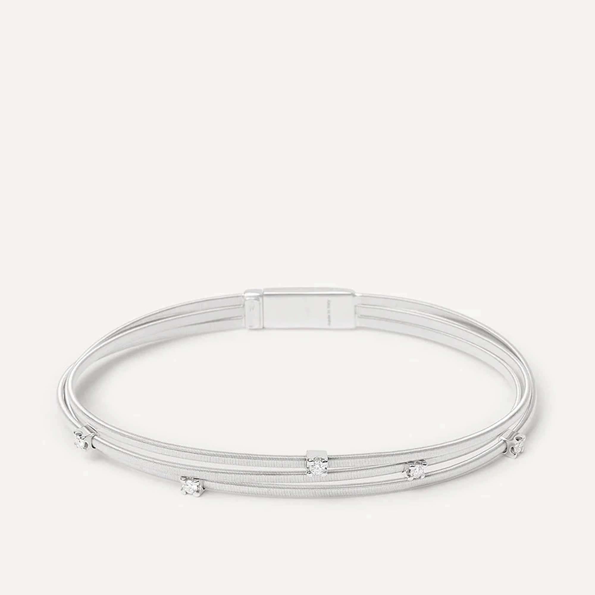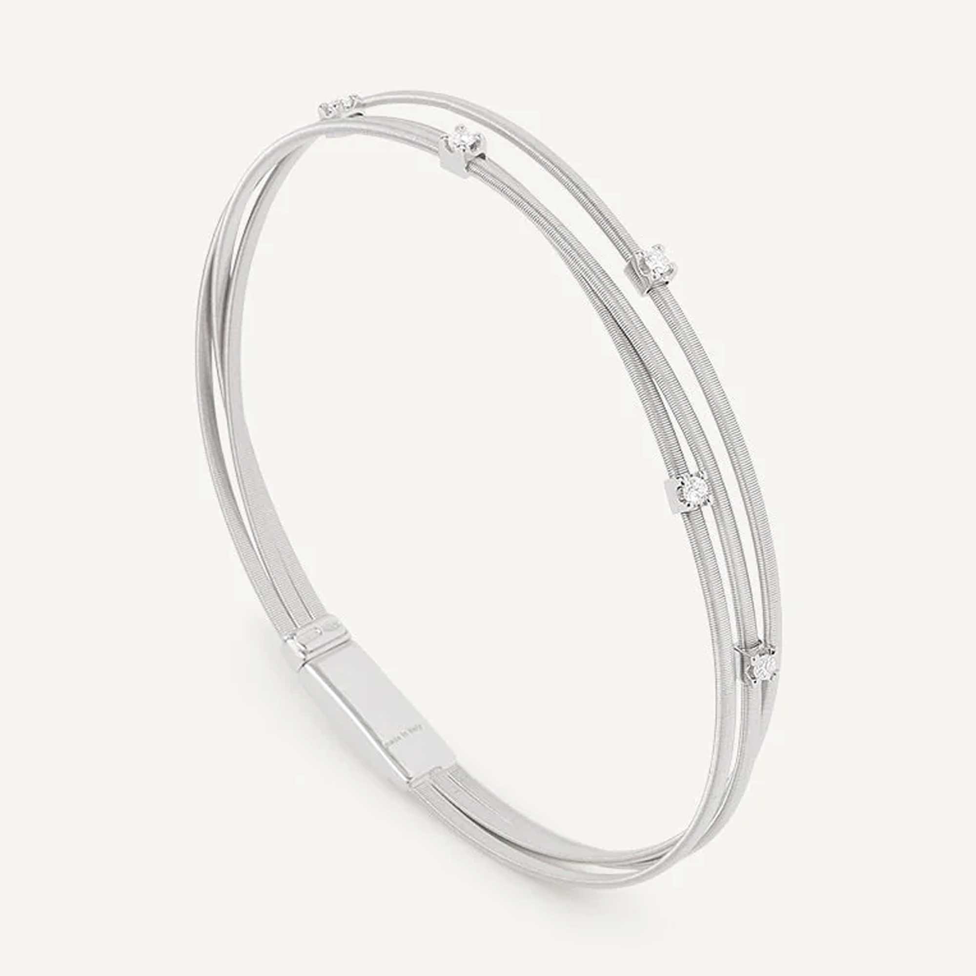 Presenting the Marco Bicego 18ct White Gold Goa Collection Three Strand Diamond Bracelet BG617 B W 01, a stunning piece designed for her. This elegant bracelet showcases a trio of intertwined strands crafted from luxurious 18ct white gold.