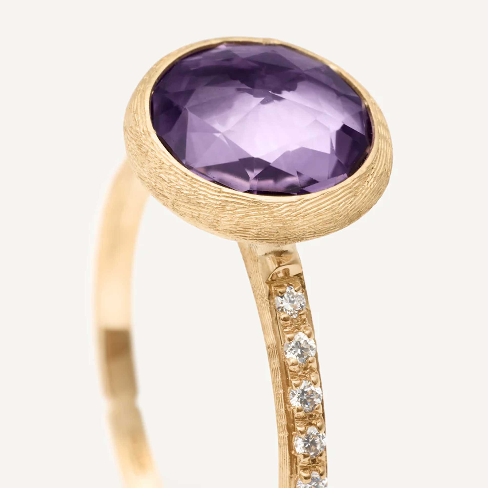 The Marco Bicego Jaipur Colour 18ct Yellow Gold Amethyst Ring AB632-B AT01 Y 02 showcases exquisite craftsmanship and elegant design. Handmade in 18ct yellow gold, this ring features a stunning rose-cut amethyst, beautifully paired with brilliant-cut diamonds. Its hand-engraved surface, crafted using the ancient Florentine technique, adds depth and texture, creating a ring that is visually intriguing.