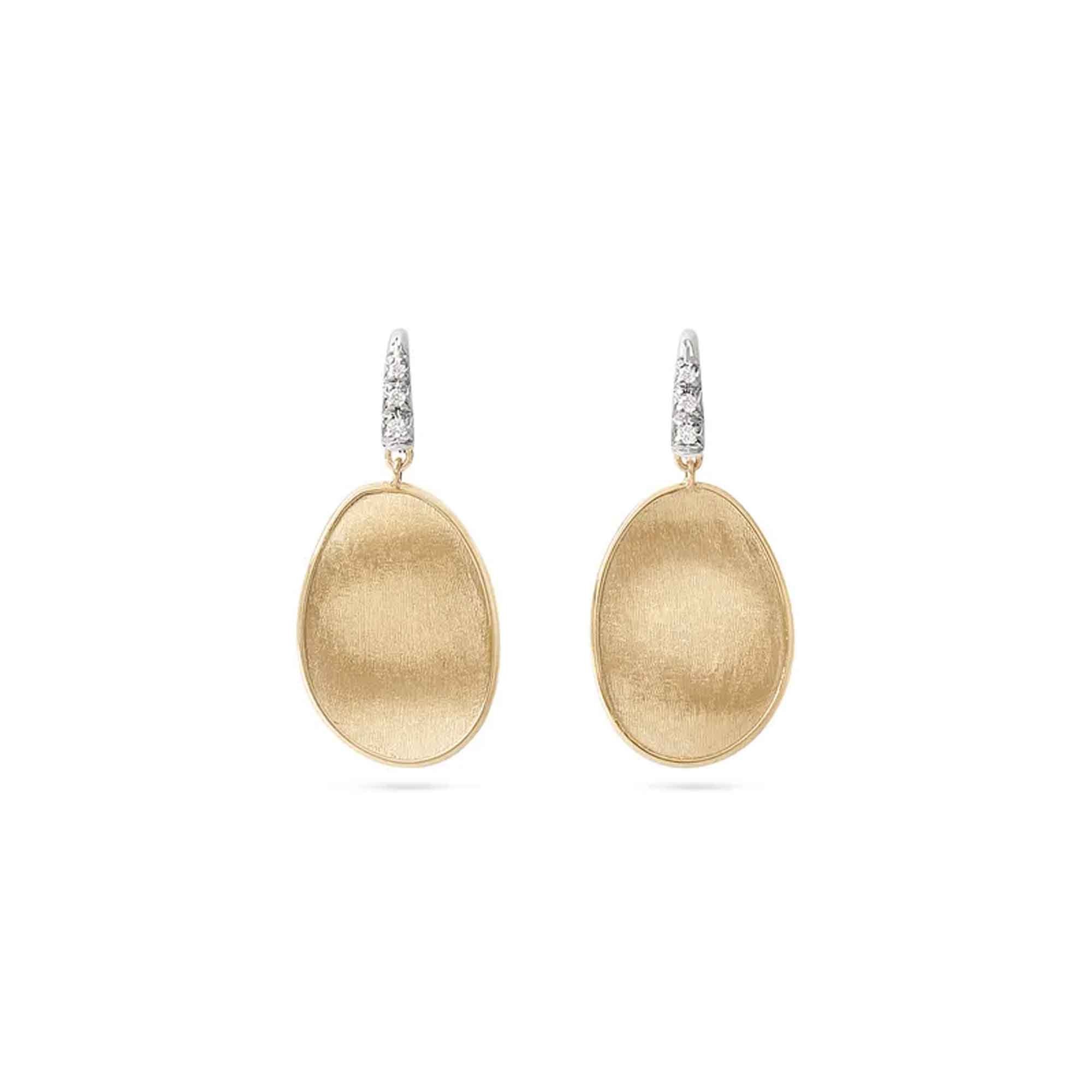 Introducing the Marco Bicego Lunaria 18ct Yellow Gold 0.05ct Diamond-Studded Earrings, a stunning addition to your jewellery collection. These earrings feature an irregularly shaped pendant, elegantly adorned with a delicate diamond pavé hook. Each leaf, crafted from 18ct yellow gold, showcases intricate hand-engraving using a traditional Florentine technique.