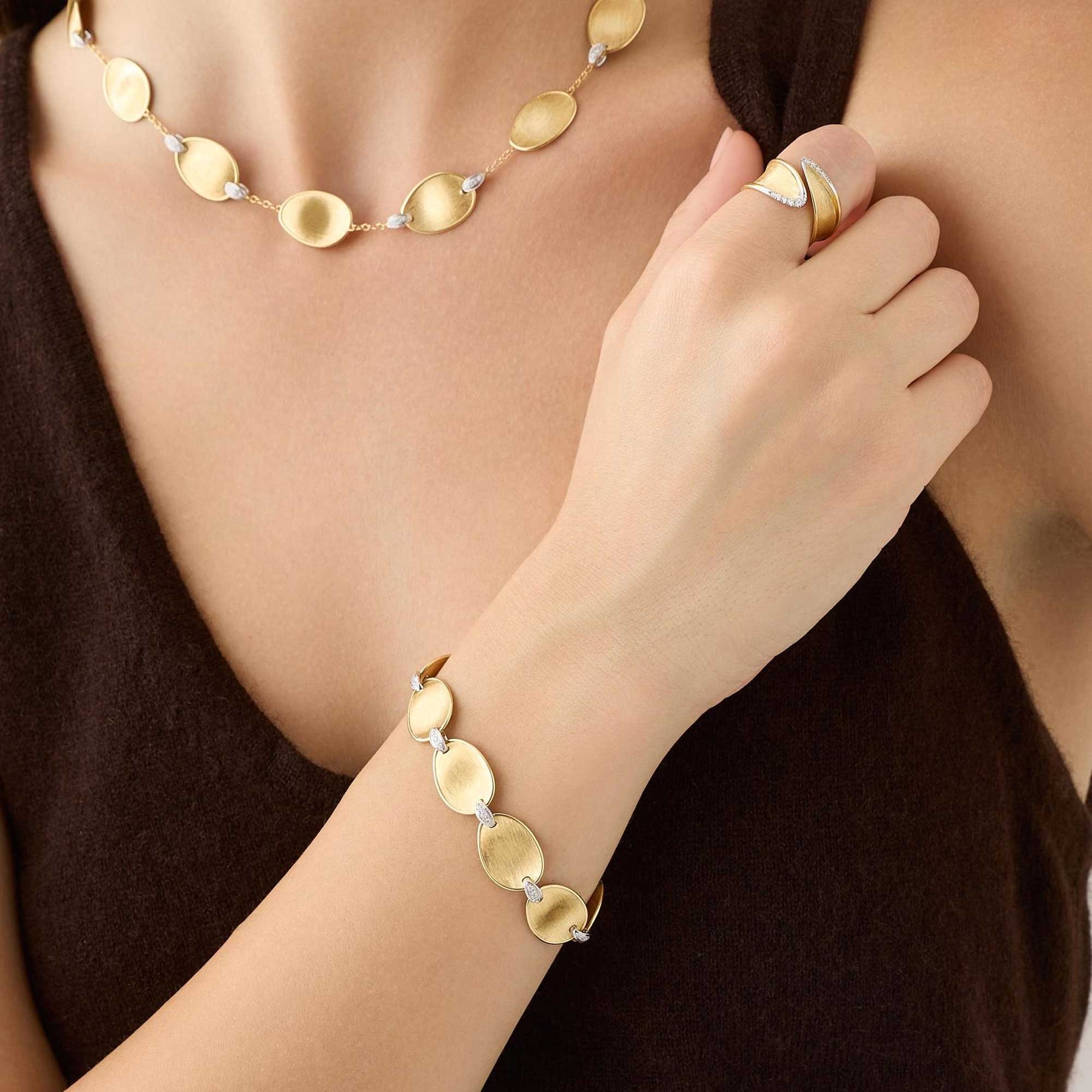 Marco Bicego Lunaria Twist 18ct Yellow Gold Ring With Diamonds ABB61 B YW Q6 showcases Italian craft with clean lines and sculptural elegance. Hand‑engraved 18ct yellow gold creates a flowing band that sits close to the finger for comfort. A fine thread of polished gold frames the leaf‑inspired form, while a delicate diamond pavé brings a subtle sparkle. The engraving grants a soft lustre and a refined, tactile character.