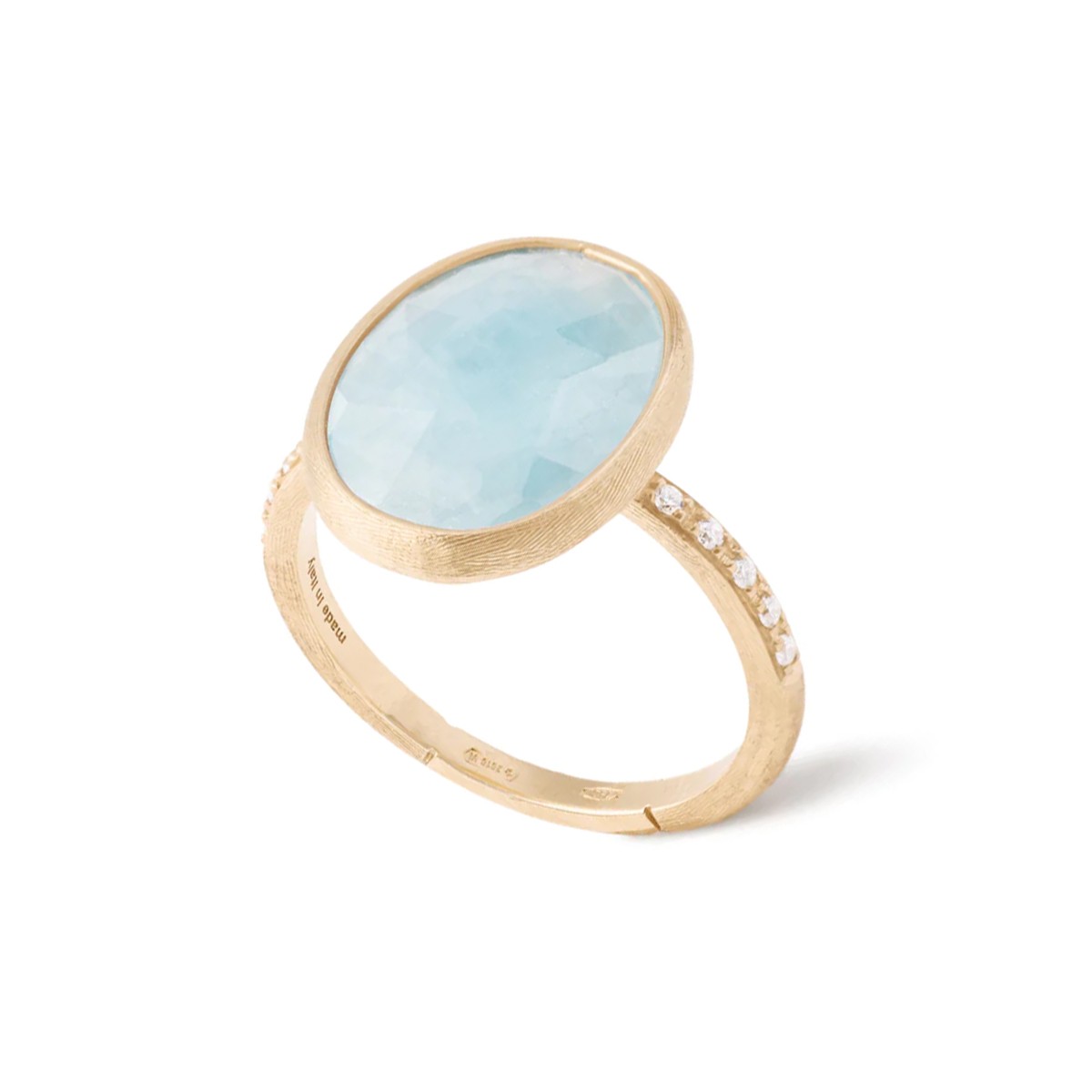 The Marco Bicego Siviglia 18ct Yellow Gold Aquamarine and Diamond Ring AB610-B AQ01 Y 02 is a stunning piece of jewellery that will captivate any woman's heart. Crafted with love and expertise, this ring is the perfect gift for her, showcasing the elegance and beauty of aquamarine and diamond stones.