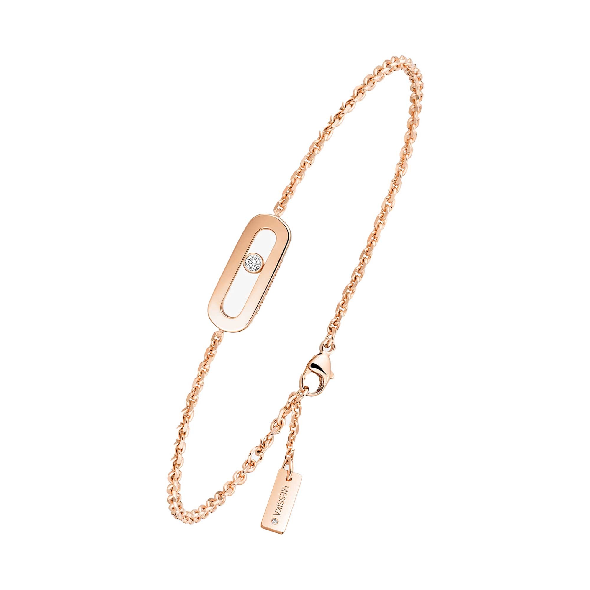 Introducing the Messika Move Uno Rose Gold 0.02ct Diamond Bracelet 14644-PG, a masterpiece of modern elegance. This handcrafted bracelet features a delicate moving diamond set within a refined rose gold motif. The total diamond weight is 0.02 carats, offering G/VS quality that reflects light beautifully.