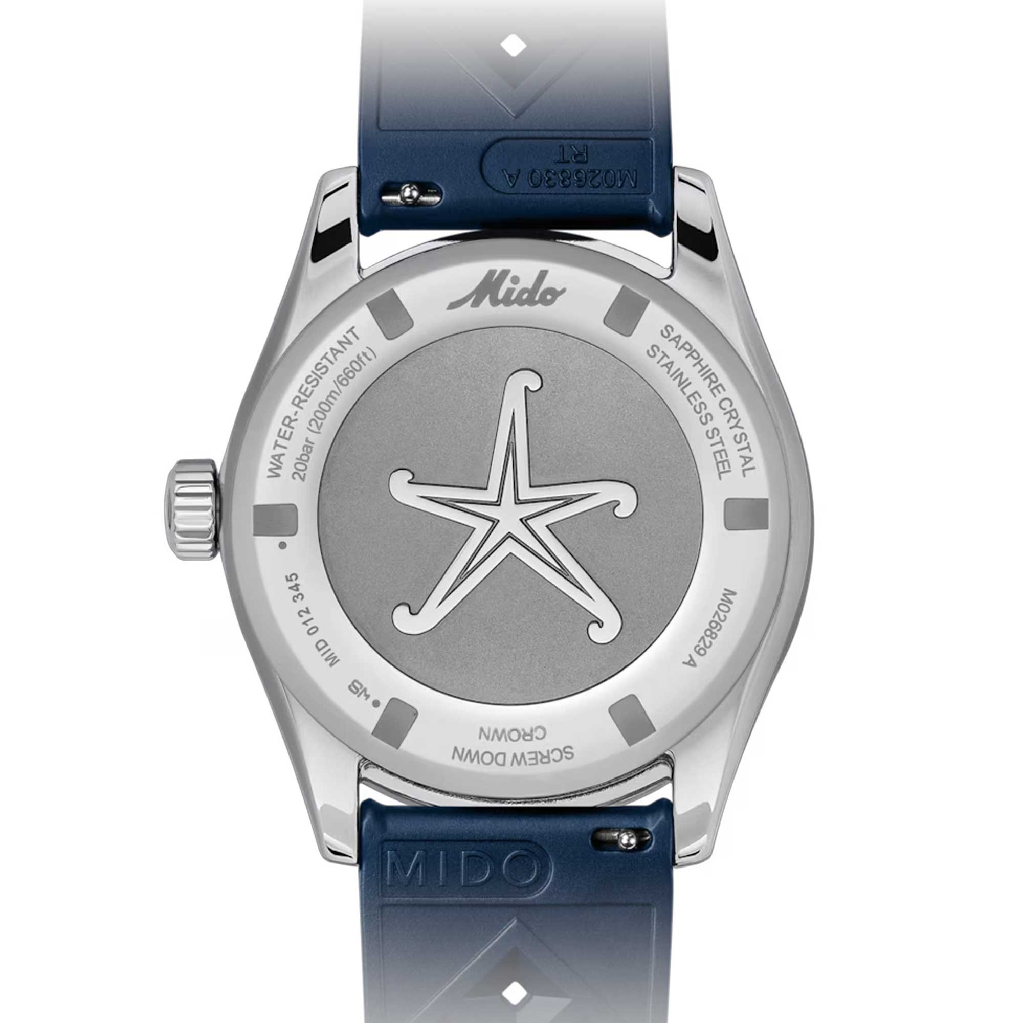Irresistible neo-vintage style, bright colours and cutting-edge technology: the new Ocean Star Decompression Worldtimer will transport connoisseurs towards new horizons. This Swiss automatic watch retains its vintage charm, and the addition of an additional time zone display propels it towards new horizons. MIDO has used the latest technologies in their continual quest for excellence: Super-LumiNova®, a glassbox-style sapphire crystal, the formidable Calibre 80 with Nivachron™ balance-spring and GMT function, as well an easy change additional strap. A starfish is engraved on the screw-down case back of this new model, which is water-resistant up to a pressure of 20 bar (200 m/660 ft).