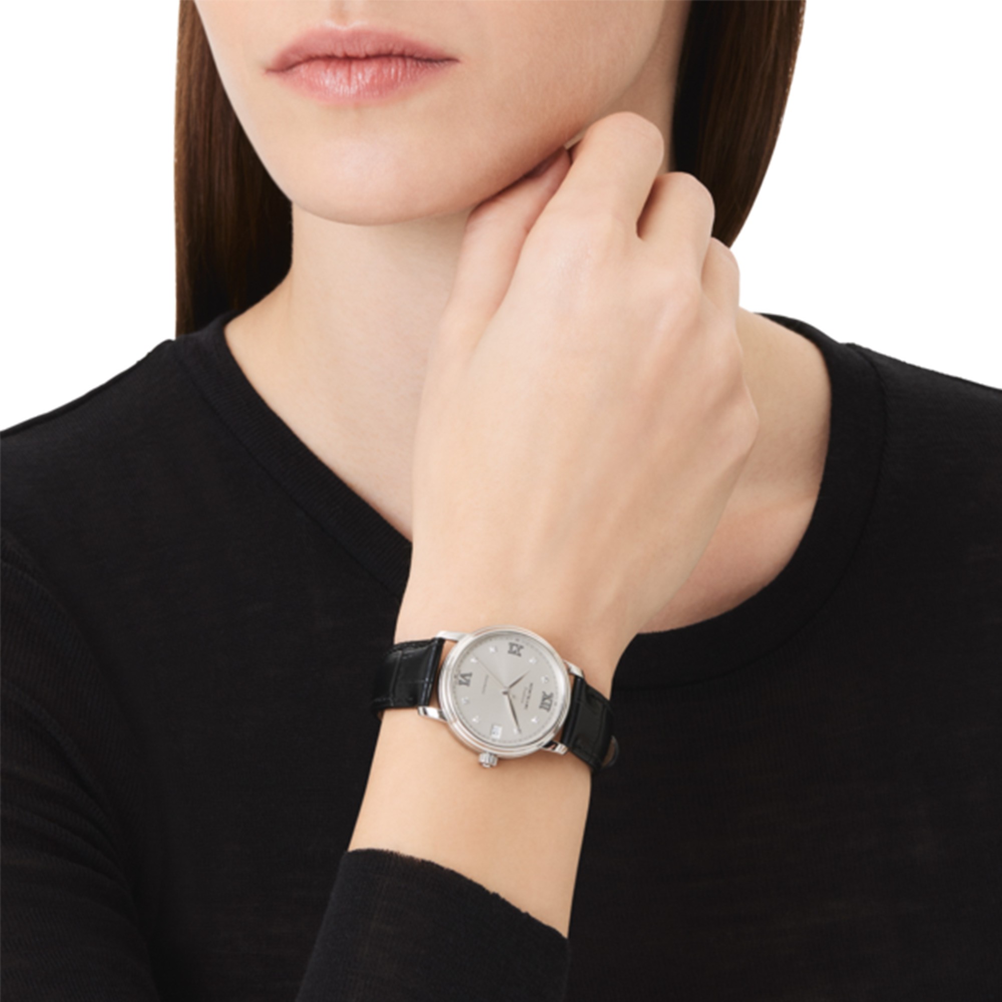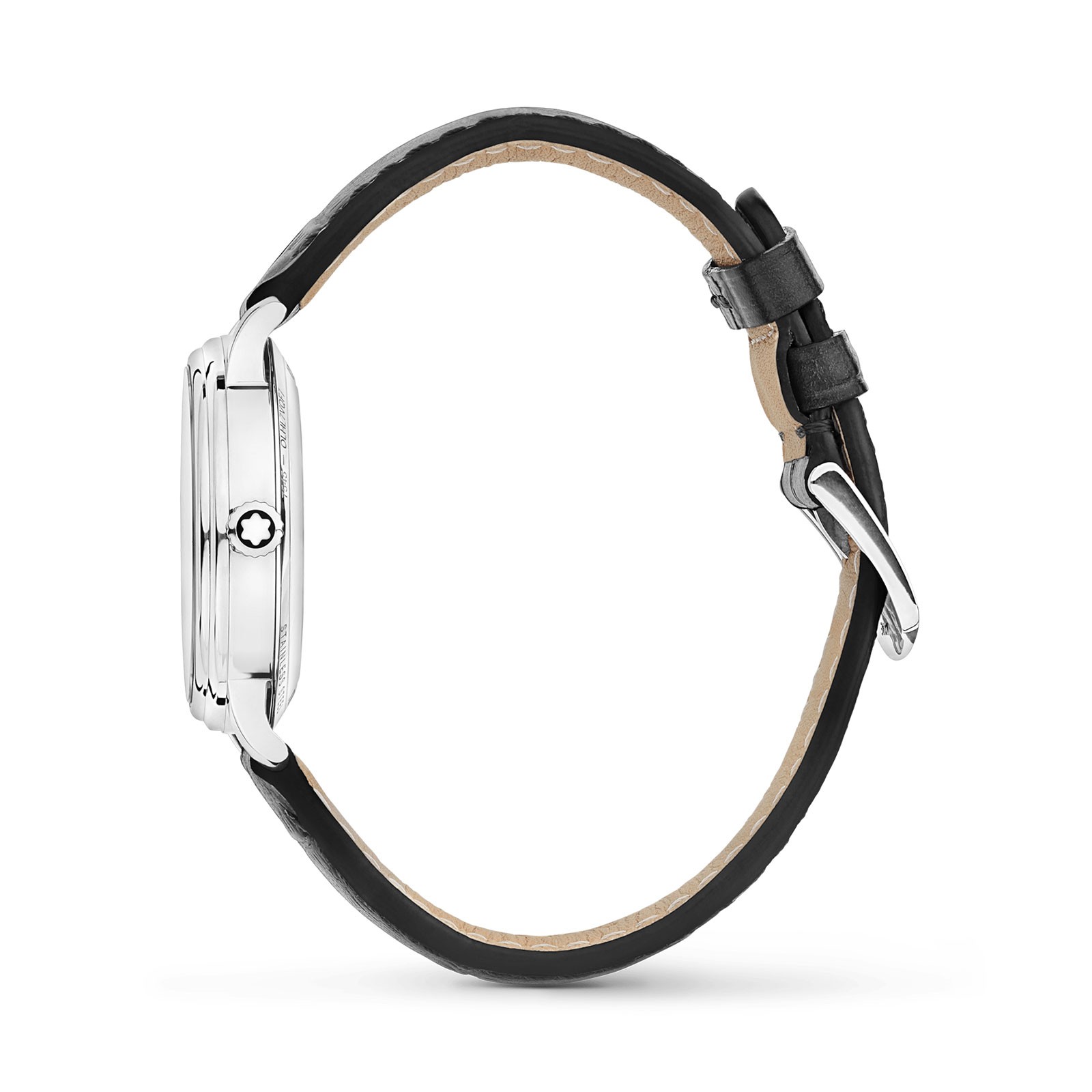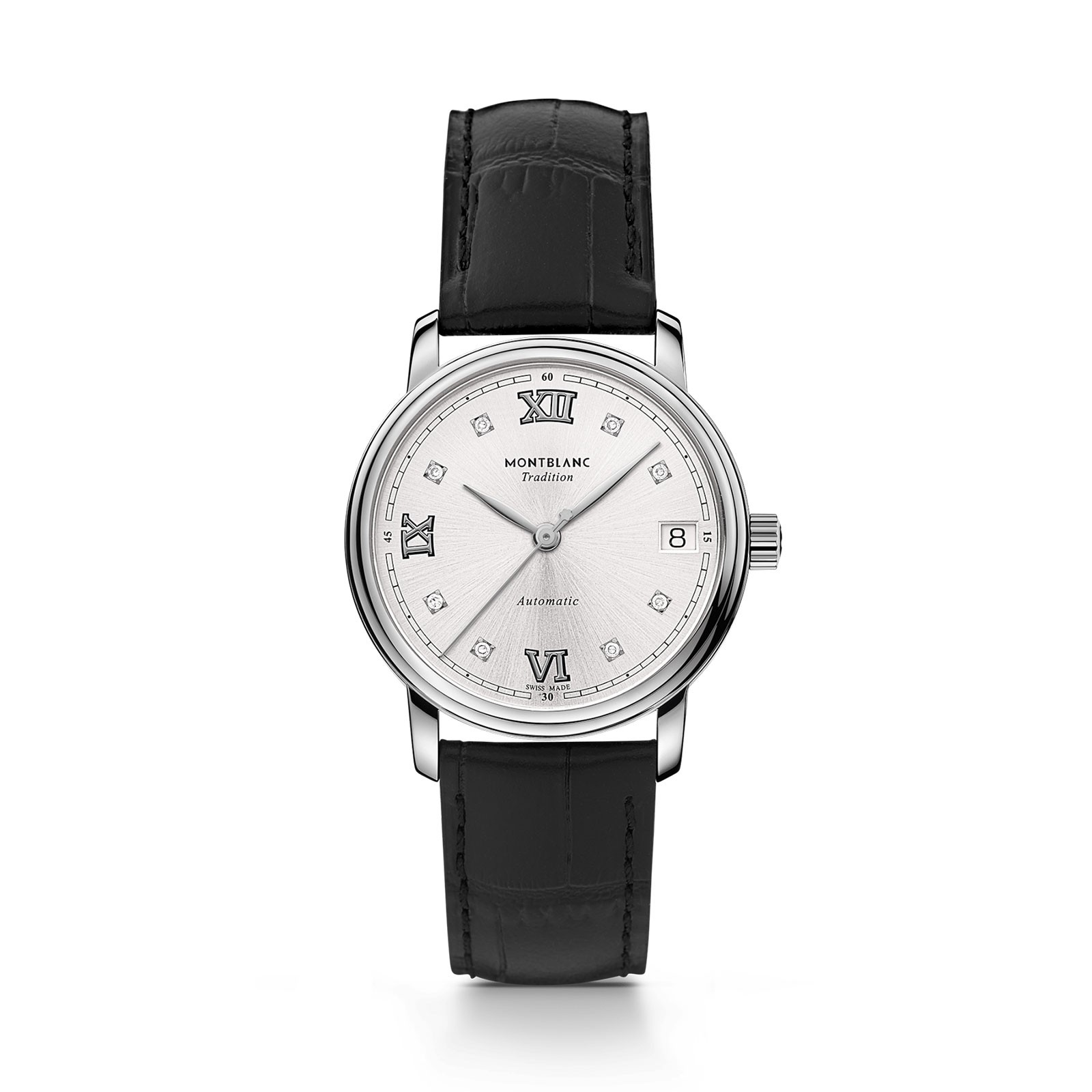 The Montblanc Tradition Collection boasts both a characteristic Montblanc design expression as well as classic watchmaking codes. The Montblanc Tradition Automatic Date comes in a 32 mm stainless steel case with straight horns and a double-shaped bezel. The timepiece features a silver-white sunray dial with rhodium-coated Roman numerals in relief and diamond indexes. The traditional railway minuterie, the classic leaf-shaped hour and minute hands, the seconds hand and crown with Montblanc emblem and the black calf strap with alligator print complete this contemporary elegant appearance. The date is displayed at 3 for very practical day-to-day use. Finally, the sapphire crystal on the case back opens on the automatic movement.