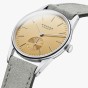 With a gold-plated polished and galvanised 33mm dial, the NOMOS Glashütte Orion 33 Ladies Watch 359 is simplicity defined. The unique profile features domed sapphire crystal glass and elongated lugs which merge with the case giving this stunning ladies watch its curved silhouette. Finished with a velour leather gray strap and fine grooves which make the small seconds dial shimmer, this classic watch is powered by the handcrafted and manual winding and highly precise Alpha caliber which you only need to wind once every two days.
