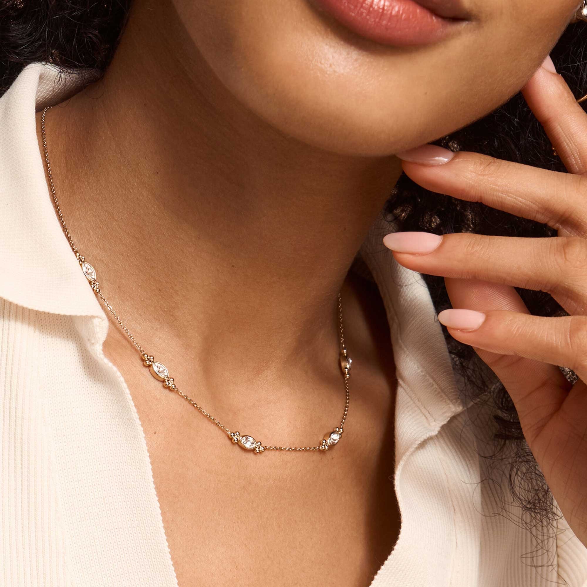 Crafted from high-quality stainless steel and plated in a radiant gold tone, this necklace promises both durability and a luxurious finish that will complement any wardrobe. The clear marquise-cut gemstones beautifully capture and reflect light, adding a sparkling touch to the necklace that is sure to turn heads and become a cherished favourite.