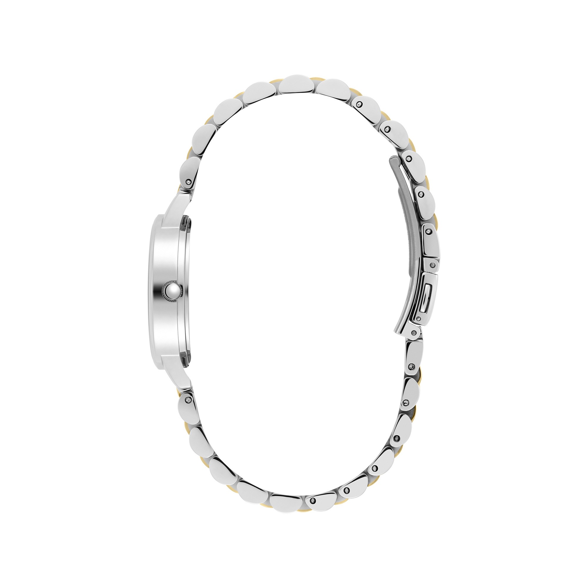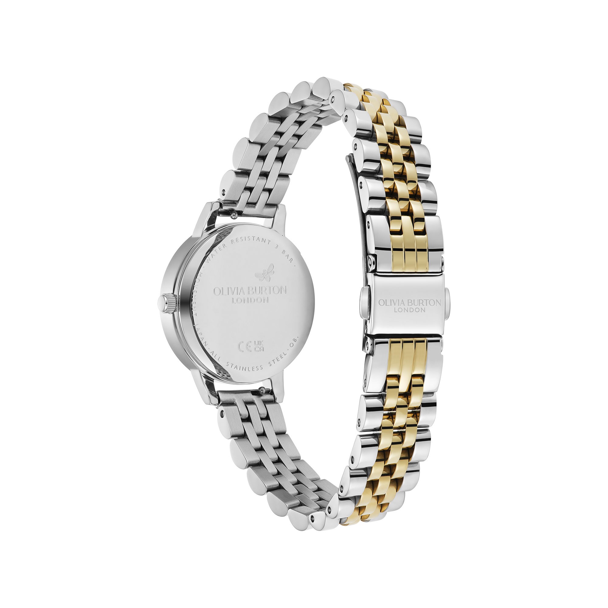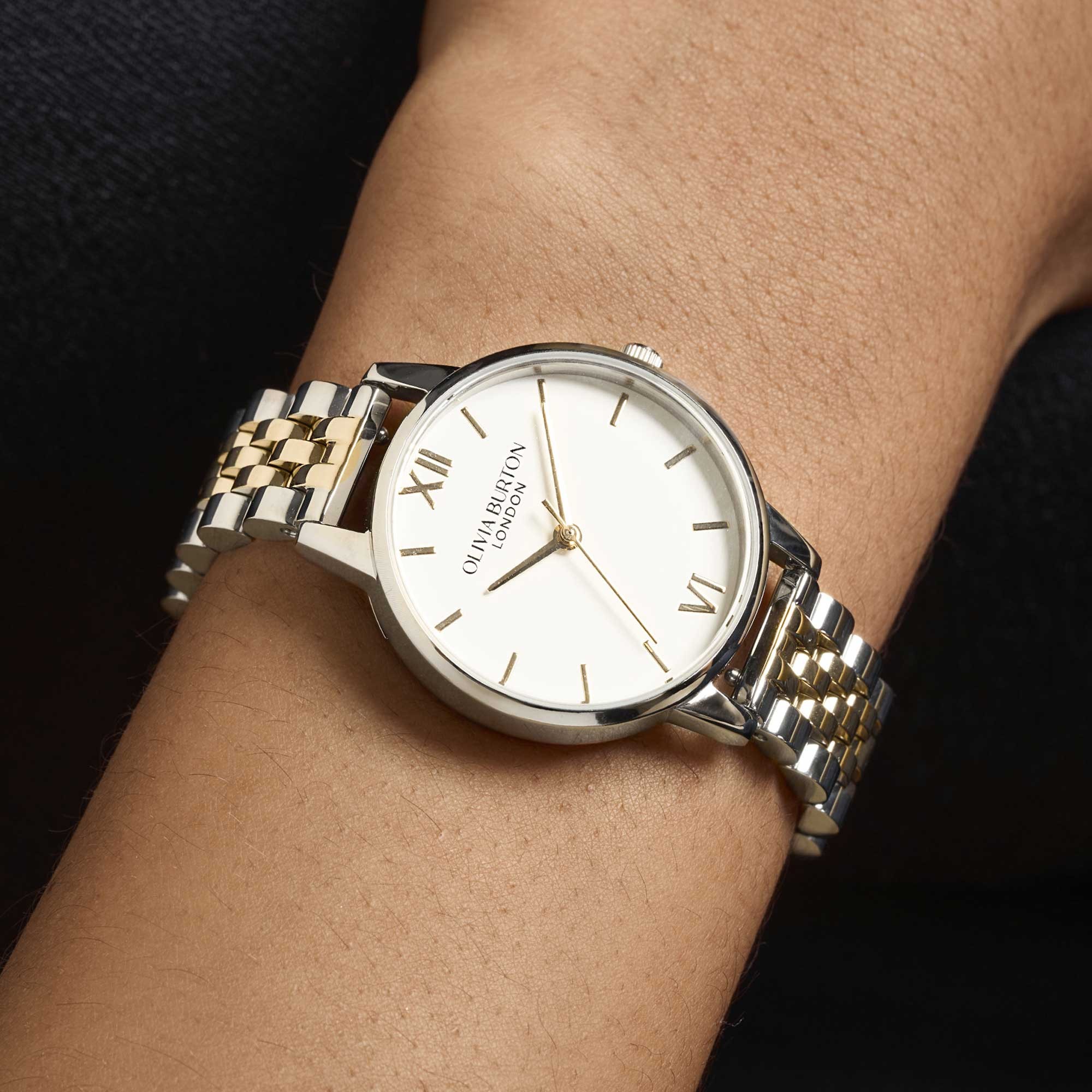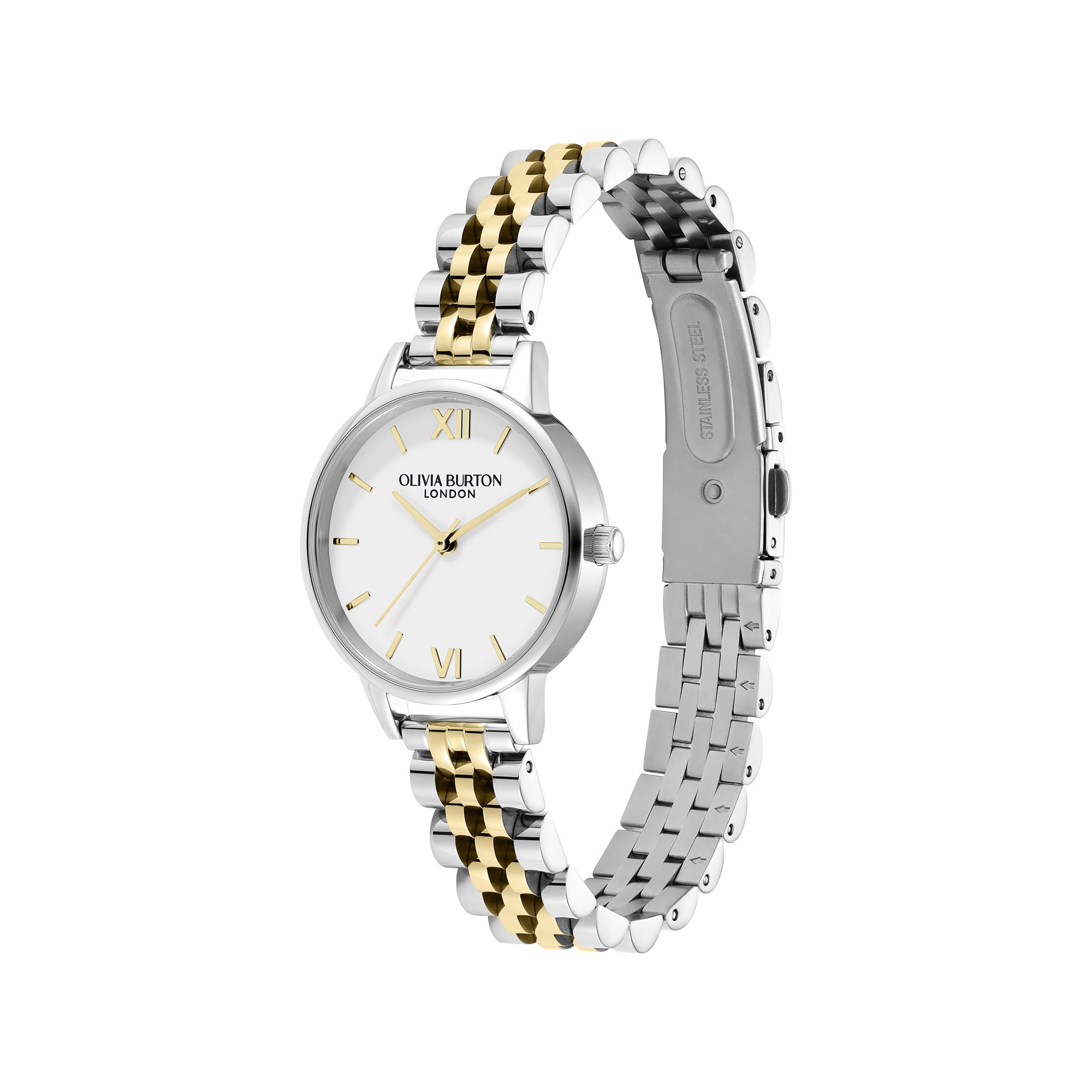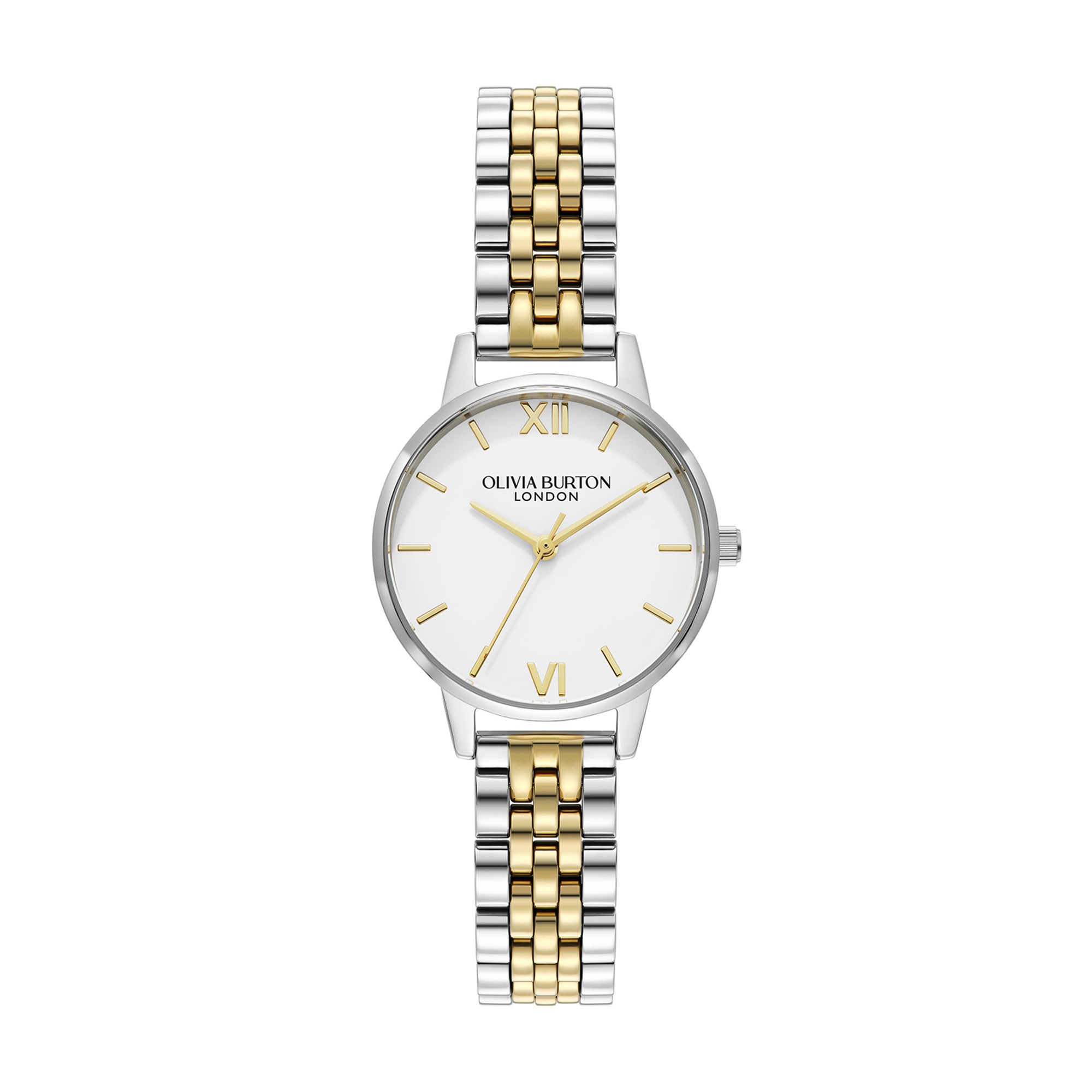 The Olivia Burton Classics Collection features stylish jewellery box staples including this Olivia Burton Classics Womens Watch OB16MDW34. Ready to shop at Chisholm Hunter, this timepiece showcases a 30mm stainless steel case holding an uncluttered white dial, finished with gold-plated Roman numeral markers. The mixed-metal stainless steel link bracelet is on trend and wearable. Powered by a three-hand quartz movement.