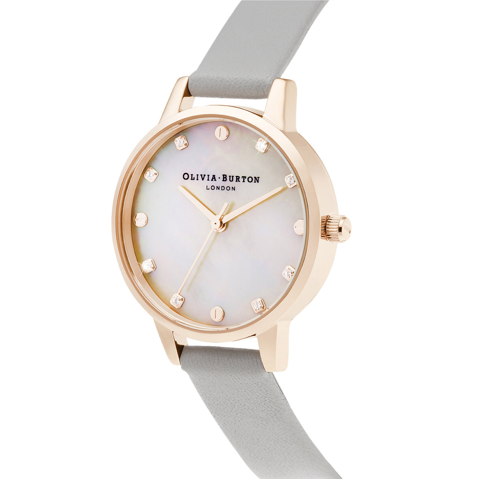 Shop the stylish Olivia Burton Classics Ladies Watch OB16SE12 from the Olivia Burton collection at Chisholm Hunter today. This 30mm ladies watch is beautifully crafted from rose-gold plated stainless steel and features a white mother of pearl dial finished with rose gold hour markers and crystal details. Presented on a grey leather strap with buckle. Powered by a quartz movement and water resistant up to 10 metres. Presented in Olivia Burton gift packaging.