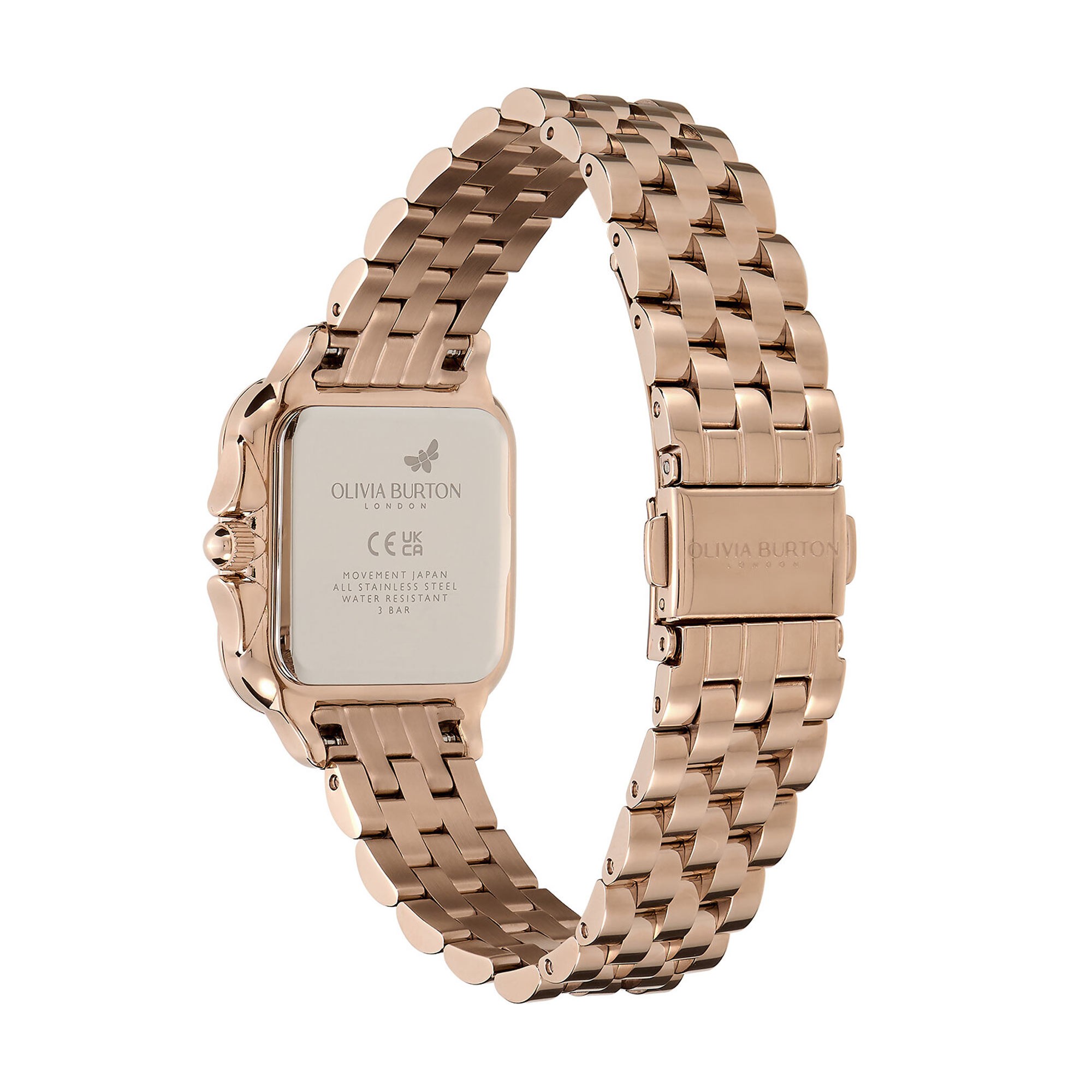Water-resistant up to 30 metres, this watch is not only a fashion-forward choice, but also suited for everyday wear. The soft square shape of the watch face adds a touch of uniqueness, making it a standout piece in any outfit. The pale rose gold iconic plated stainless steel case material further enhances its glamorous appeal, while the rose gold face colour adds a warm and luxurious touch.