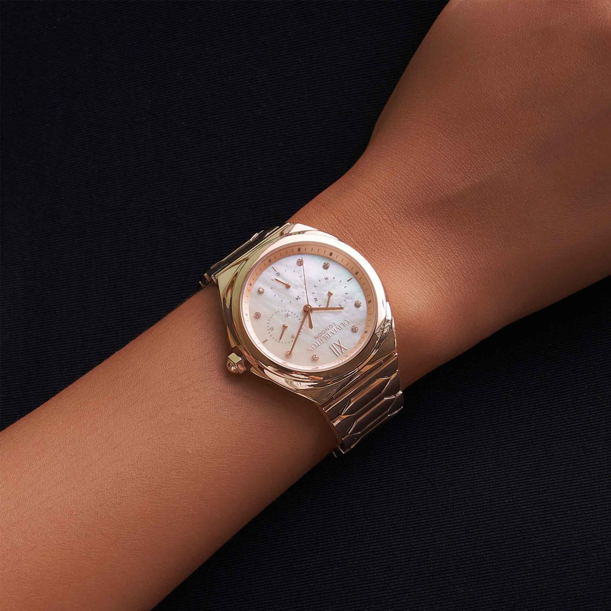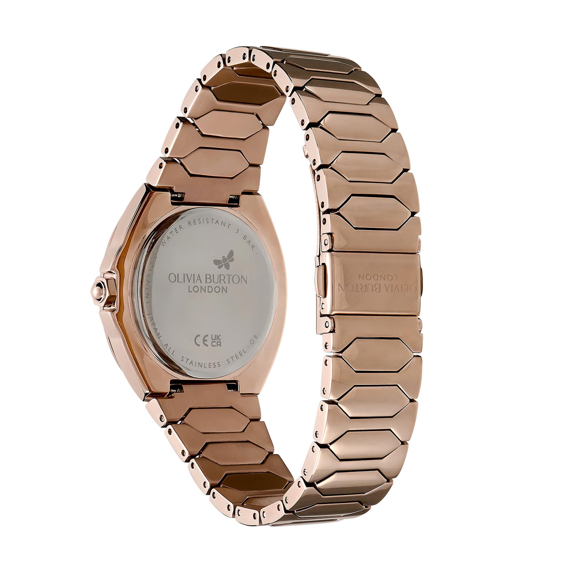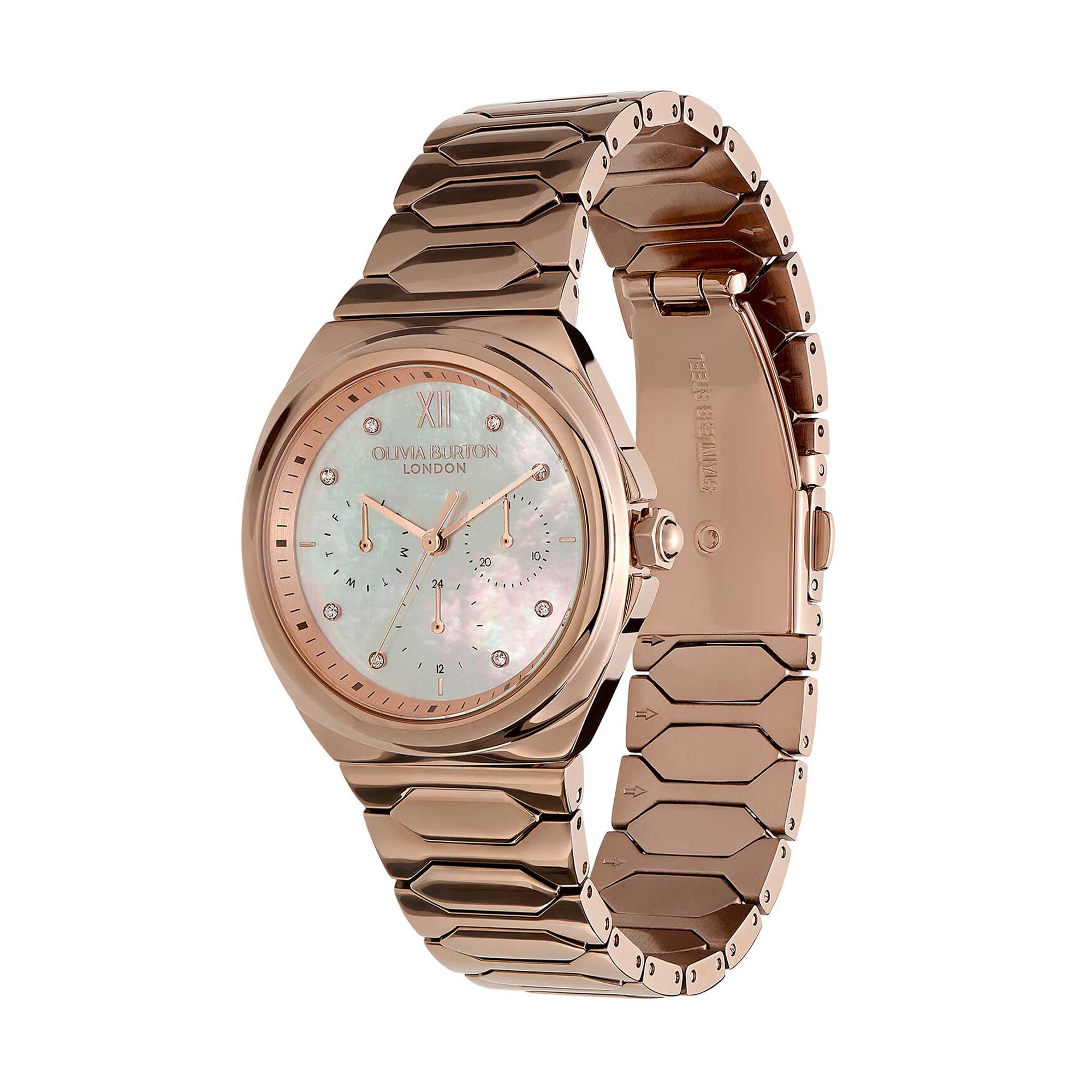 It’s all about the curves with this elegant take on Sports Luxe. A gently-domed case encircles the multifunction dial in ethereal white Mother of Pearl with crystal markers. It’s finished with a new bracelet strap inspired by an Olivia Burton favourite…the honeycomb. The hexagonal links give a playful feel to a pretty rose gold finish.