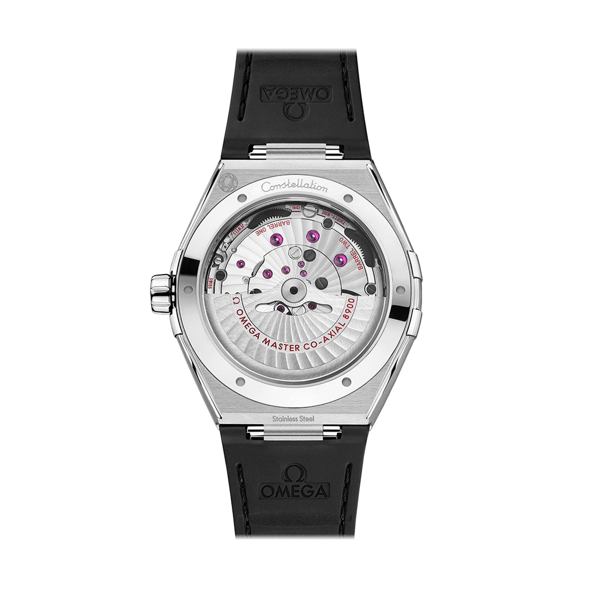 Presented on a black leather strap with rubber lining, this timepiece is driven by the OMEGA Co-Axial Master Chronometer Calibre 8900, visible through the domed scratch-resistant sapphire crystal.