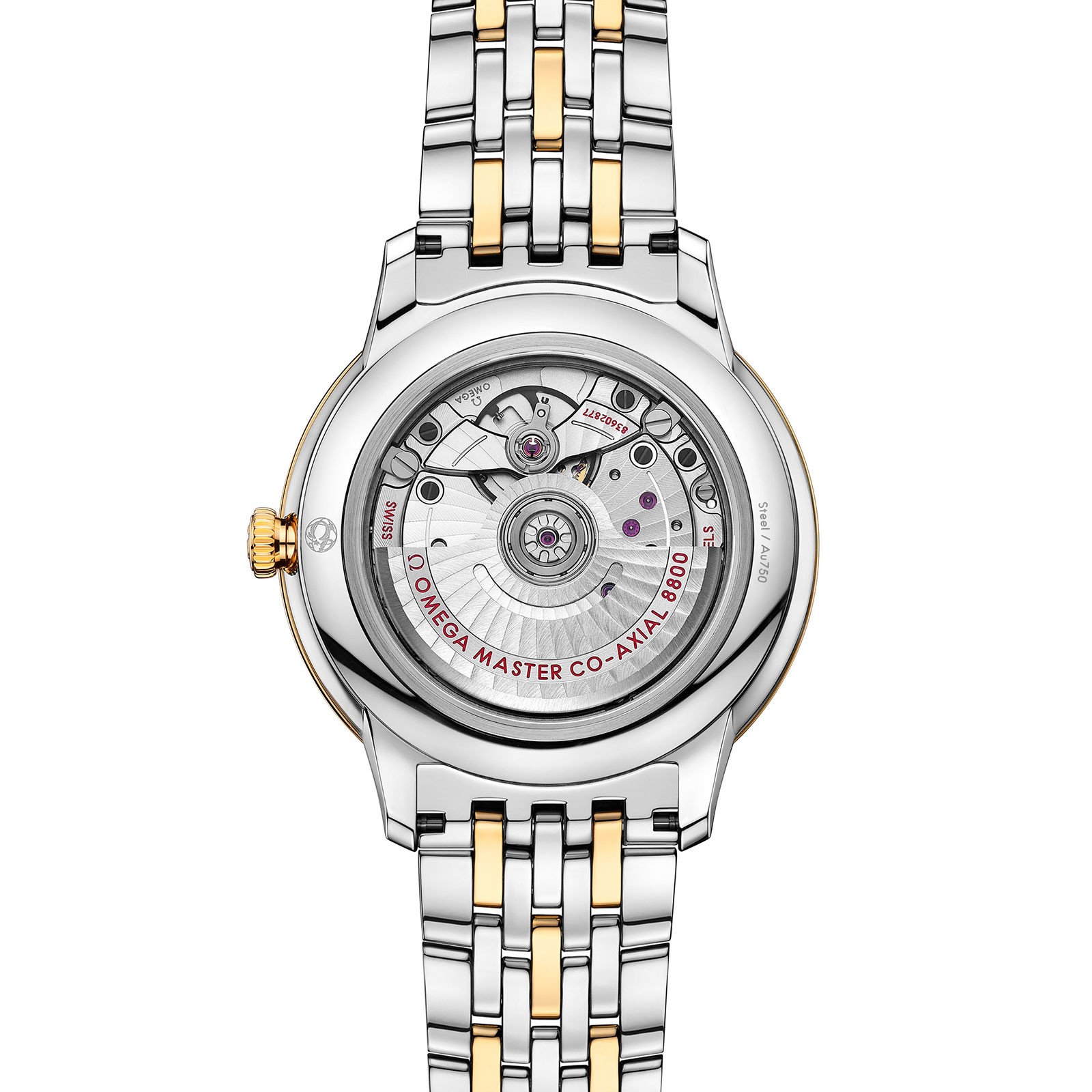 A timeless collection since 1994, the OMEGA De Ville Prestige is now in its third generation. Continuing to represent classical design and refined elegance, the timepieces offer a range of patterns, finishes and colours to suit different lifestyles and personalities. In this 40 mm stainless steel - 18K yellow gold model, the domed PVD Moonshine™ Gold dial features a sun-brushed finish. The display is distinguished by yellow gold-plated hands, as well as alternating Roman numerals and cabochon indexes. The pure look of the timepiece is completed by a date window at 6 o’clock, and a railway minute track on the outer zone. This Master Chronometer certified watch is presented on a stainless steel - yellow gold bracelet and is driven by the OMEGA Master Co-Axial Calibre 8800, which can be admired through the scratch-resistant sapphire crystal caseback.