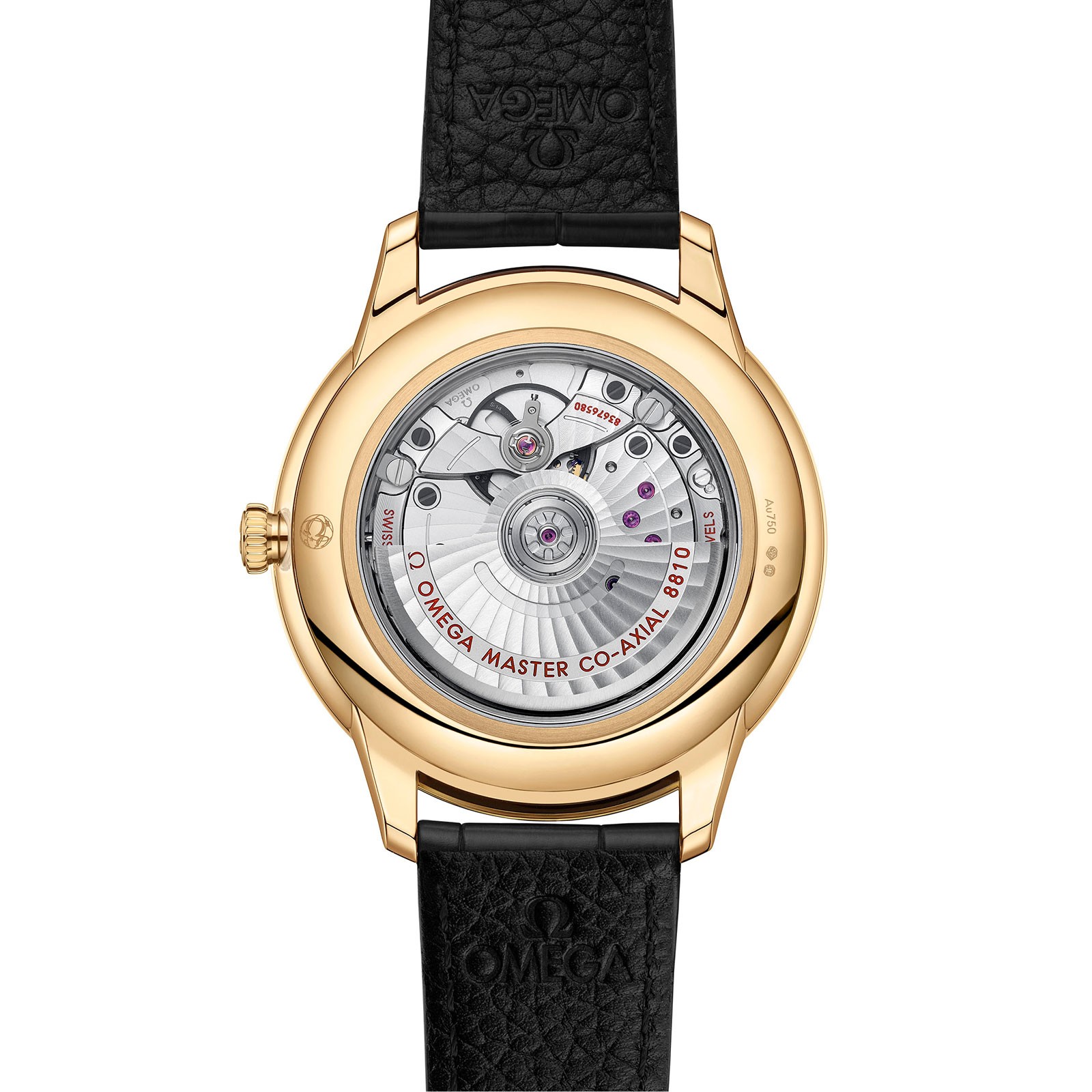 This Master Chronometer certified watch is presented on a black leather strap and is driven by the OMEGA Master Co-Axial Calibre 8810, which can be admired through the scratch-resistant sapphire crystal caseback.