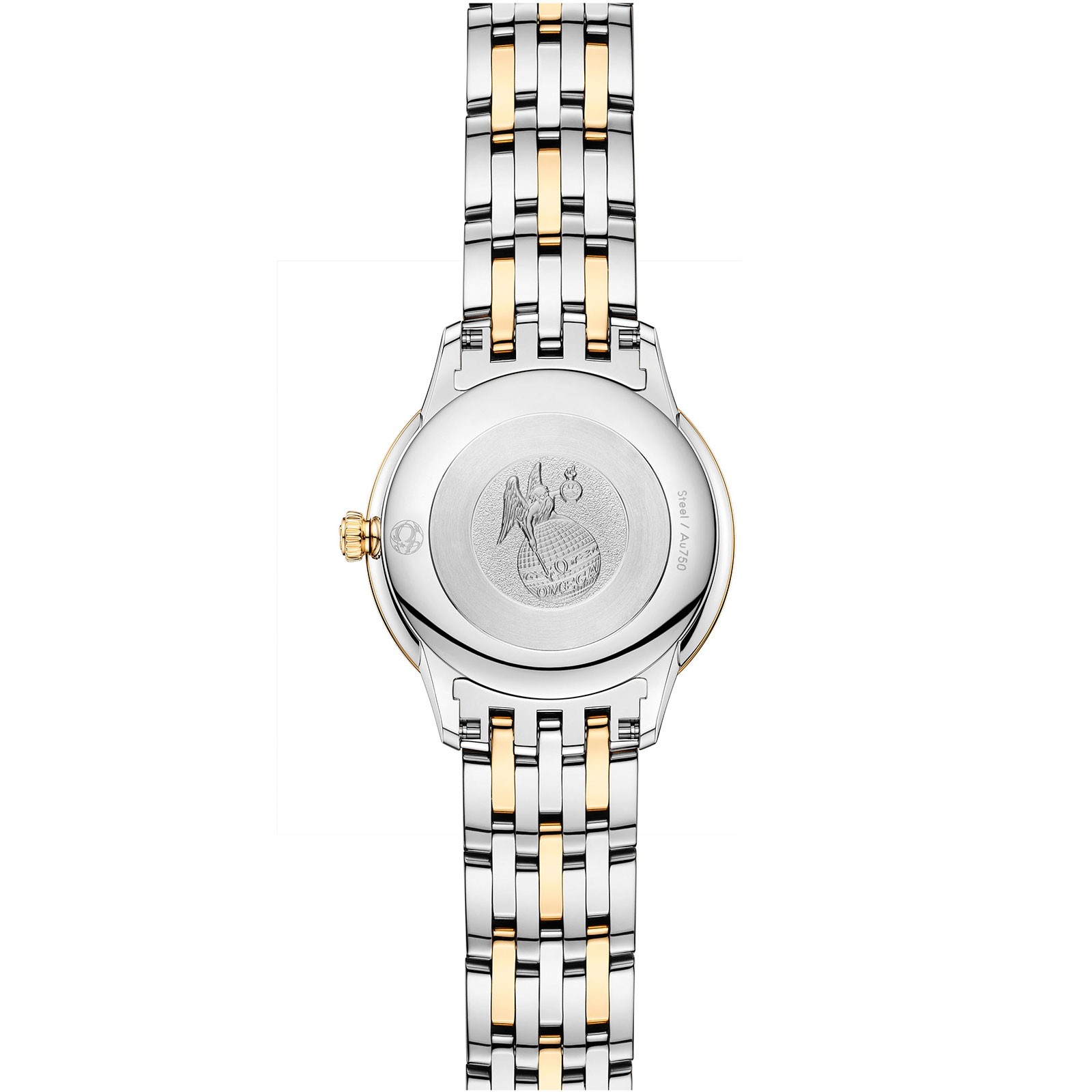 A timeless collection since 1994, the OMEGA De Ville Prestige is now in its third generation. Continuing to represent classical design and refined elegance, the timepieces offer a range of patterns, finishes and colours to suit different lifestyles and personalities. In this 27.5 mm stainless steel - 18K yellow gold model, the dial is crafted from white mother-of-pearl. The display is distinguished by yellow gold-plated hands, as well as alternating Roman numerals and cabochon indexes. The pure look of the timepiece is completed by a full caseback embossed with a God Chronos medallion. This watch is presented on a stainless steel - yellow gold bracelet and is driven by the OMEGA Quartz Calibre 4061, with a battery life of at least 48 months.