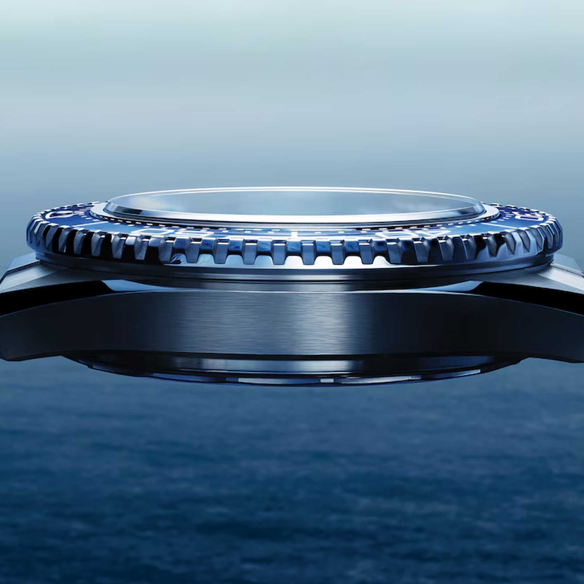 This 42 mm model is crafted with a case in polished-brushed stainless steel. It features a polished blue ceramic bezel ring with a diving scale in white enamel, while the inner ring is made from polished grade 5 titanium.