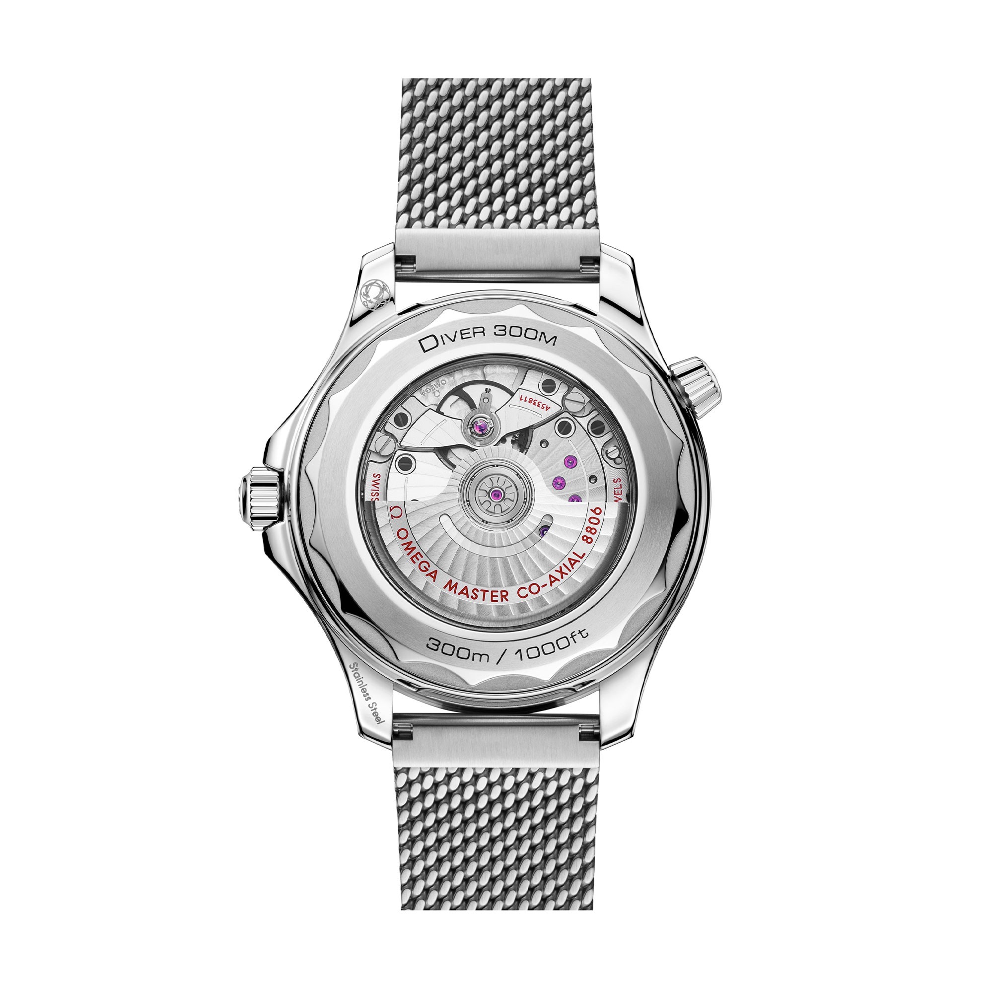 This watch uses an automatic movement, powered by the OMEGA Co-Axial Master Chronometer Calibre 8806, visible through the sapphire-crystal caseback. The silver dial features dot and baton markers, making time-reading effortless. With a water resistance of up to 300 metres, it is engineered for both aquatic and everyday adventures.