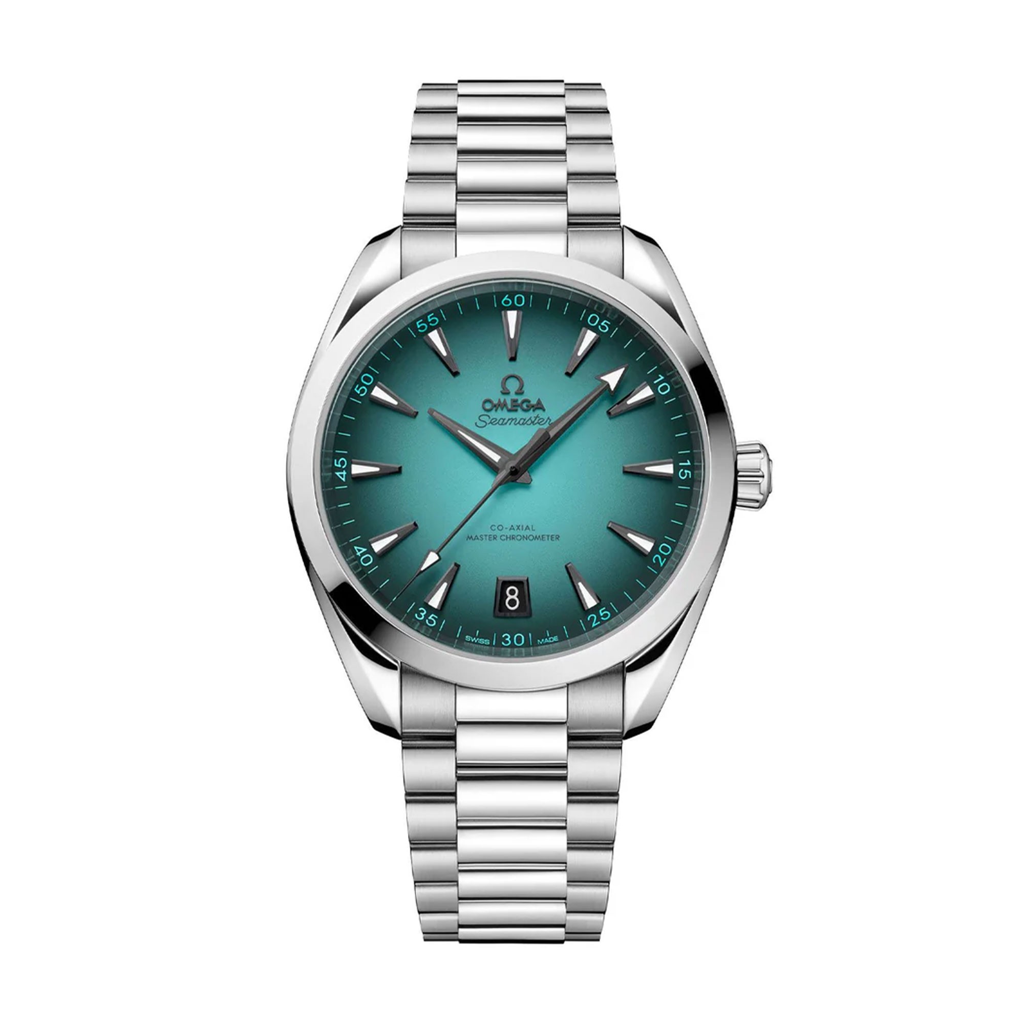 The OMEGA Seamaster Aqua Terra 150M 38mm Watch 220.10.38.20.03.005 is a testament to OMEGA’s maritime legacy. This model features a 38 mm symmetrical stainless steel case and a striking turquoise dial with a black gradient effect. The dial showcases facetted hands and hour markers, all treated with grey PVD and illuminated by white Super-Luminova for easy readability.