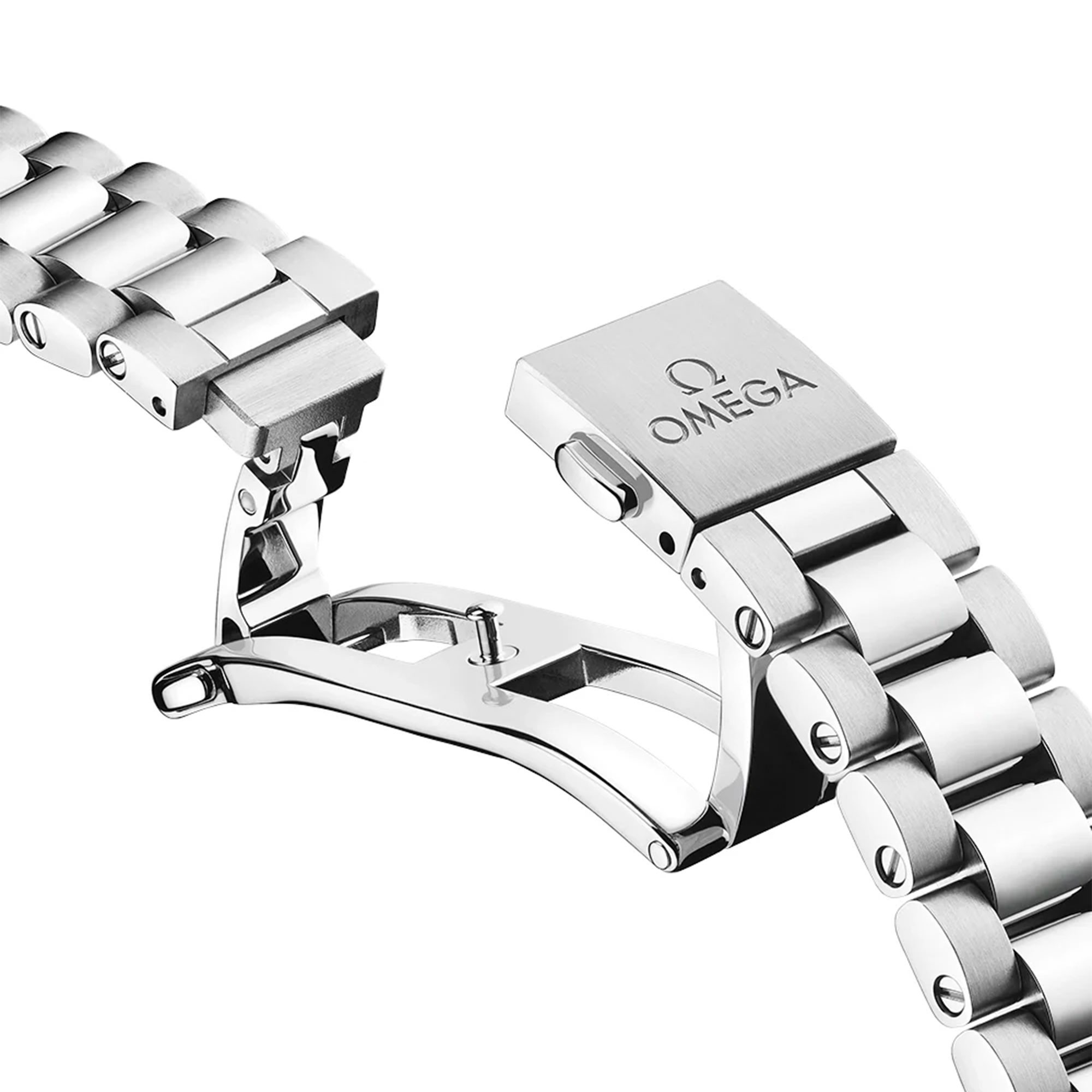 The stylish grey PVD OMEGA logo and date window contribute to the watch's cohesive design. Comfort is key, provided by an integrated brushed and polished metal bracelet that features OMEGA’s smart adjustment system, allowing a comfortable fit for everyday wear.