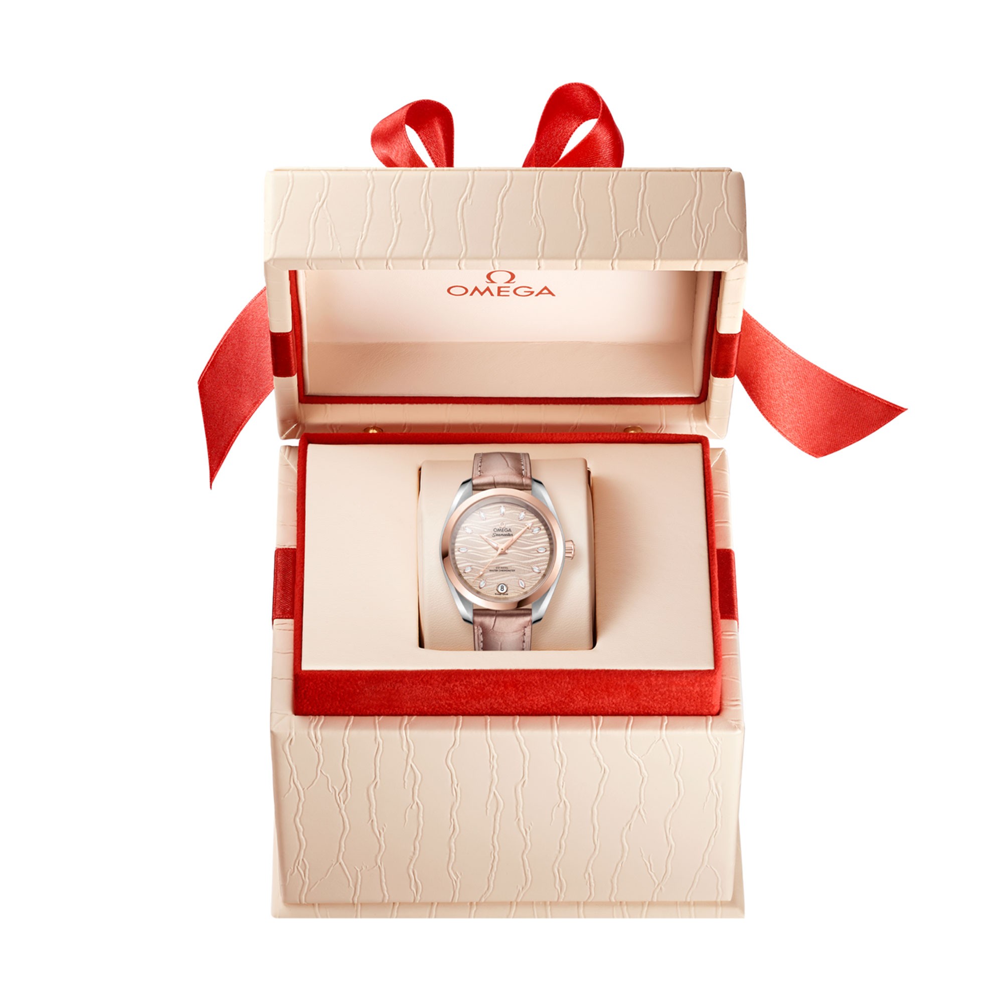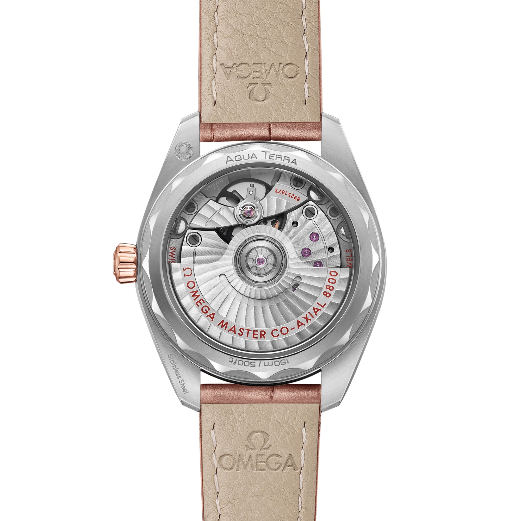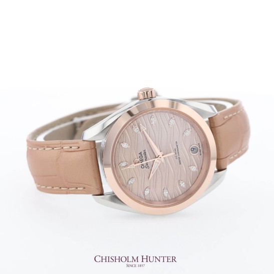 The OMEGA Seamaster Aqua Terra 150m Co-Axial Master Chronometer 34mm 22023342059001 Ladies Watch is the definition of elegance. OMEGA's beautiful 34mm Seamaster has a symmetrical case in stainless steel and 18K Sedna™ gold and a polished bezel. The nude wave-embossed dial has central hour/minute and seconds hands in diamond-polished 18K Sedna™ gold, a date window at 6 o’clock and 11 marquise-cut diamond hour markers. It is presented on a beige shimmering leather strap and is powered by OMEGA's Co-Axial Master Chronometer calibre 8800, certified at the industry’s highest standard by the Swiss Federal Institute of Metrology (METAS).