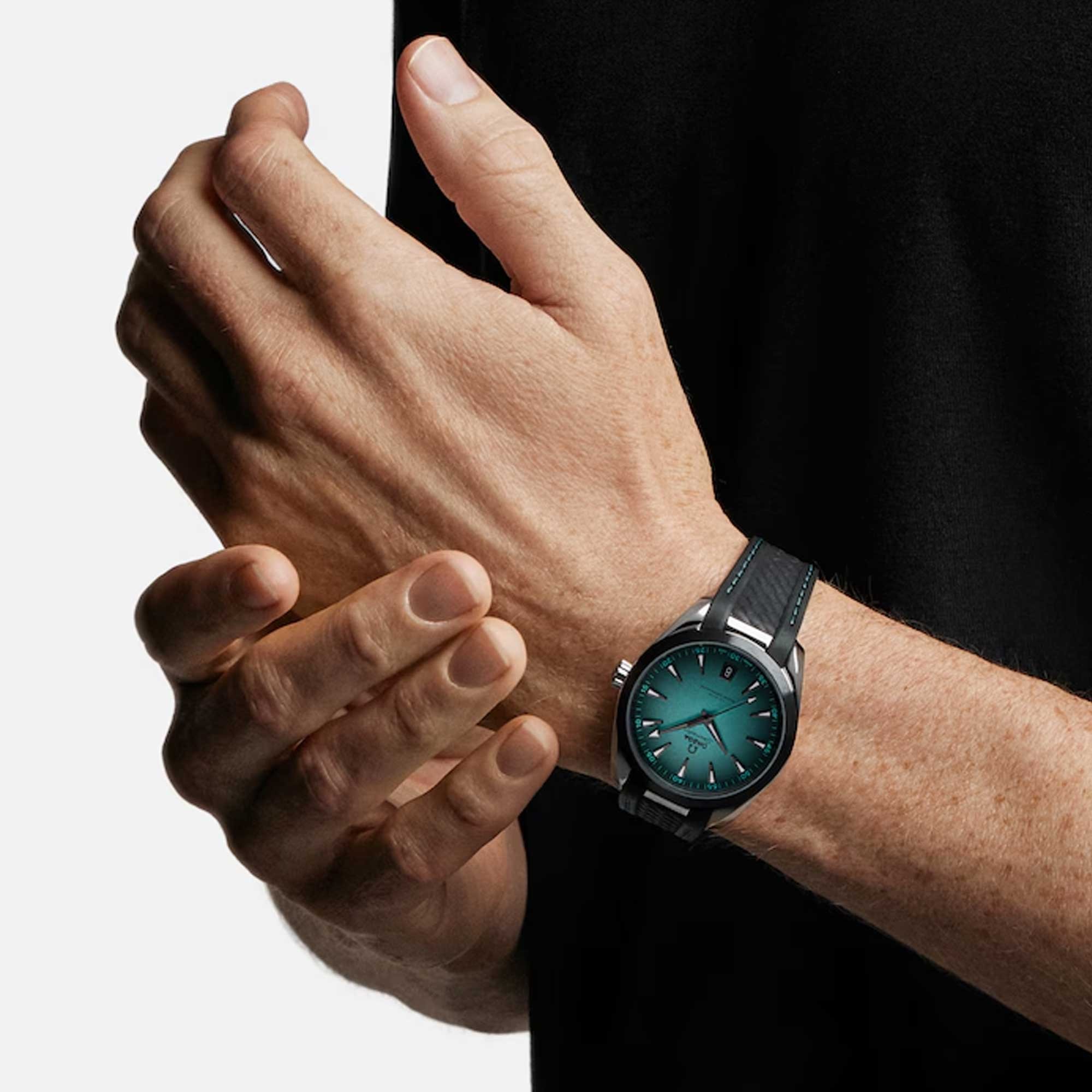 The dial displays facetted hands and hour markers, all treated with grey PVD, enhancing readability. The integration of white Super-Luminova ensures visibility in low light conditions. The OMEGA logo and date window, also in grey PVD, maintain a cohesive aesthetic with the dial’s colour scheme.