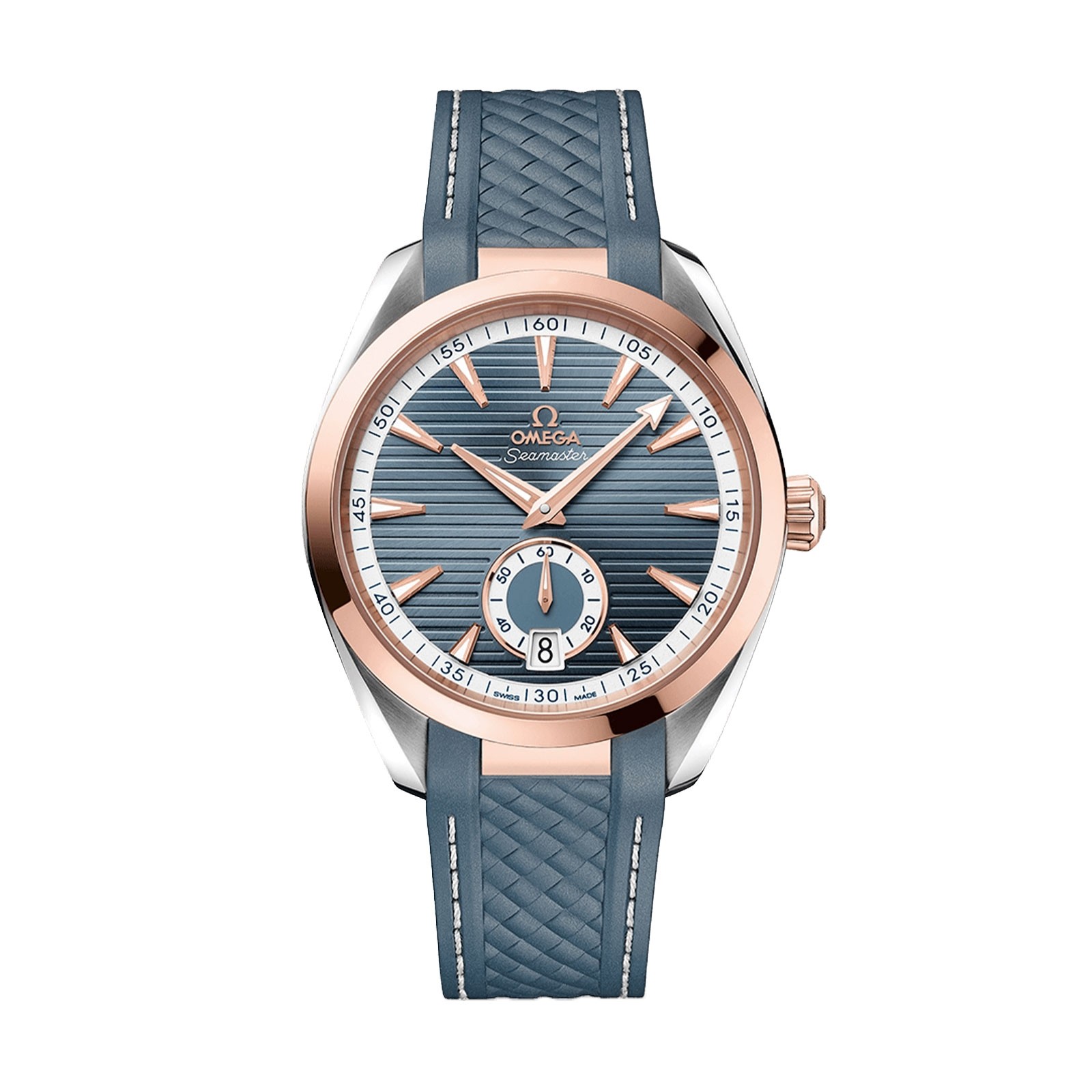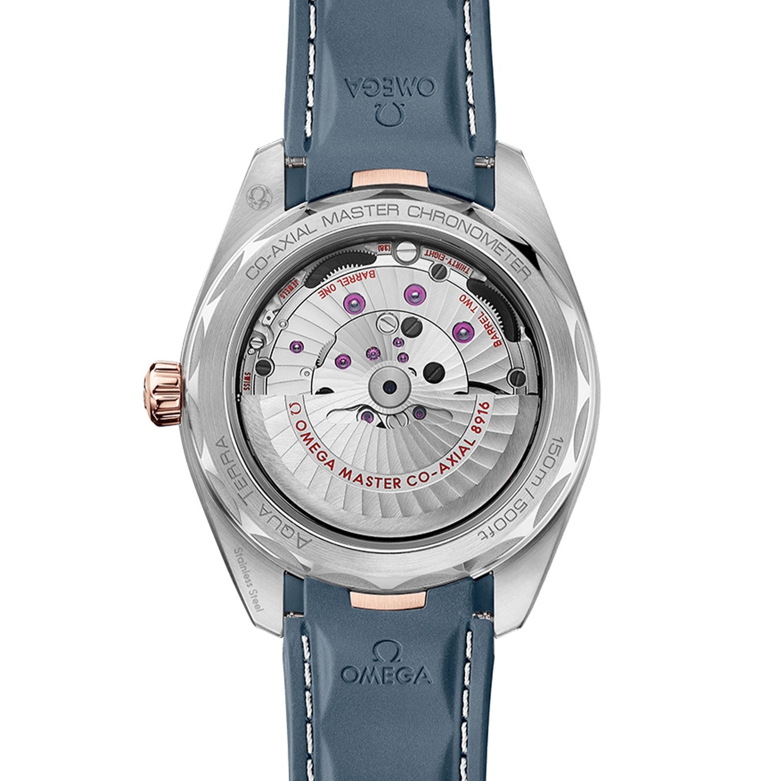 Presented on a structured blue rubber strap with grey stitching, this timepiece is powered by the OMEGA Co-Axial Master Chronometer calibre 8916, certified at the industry’s highest standard by the Swiss Federal Institute of Metrology (METAS).