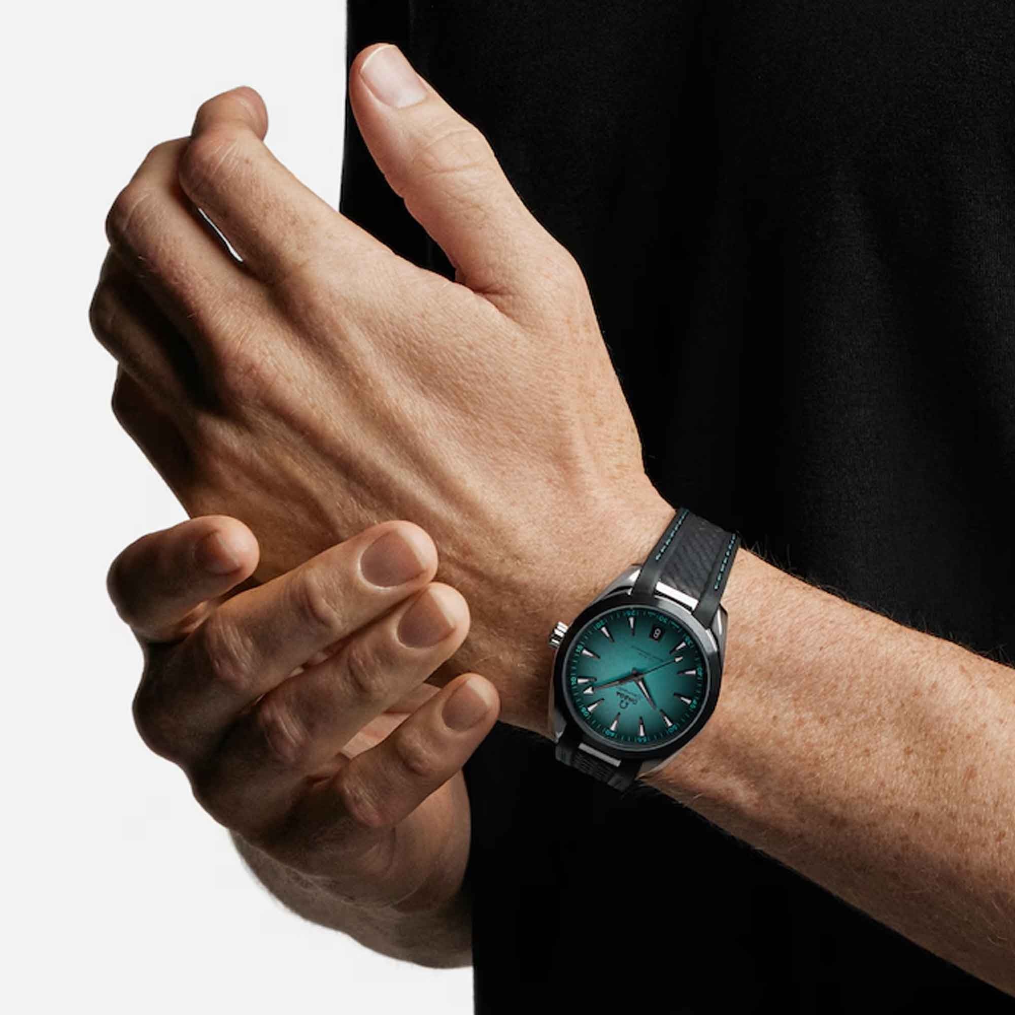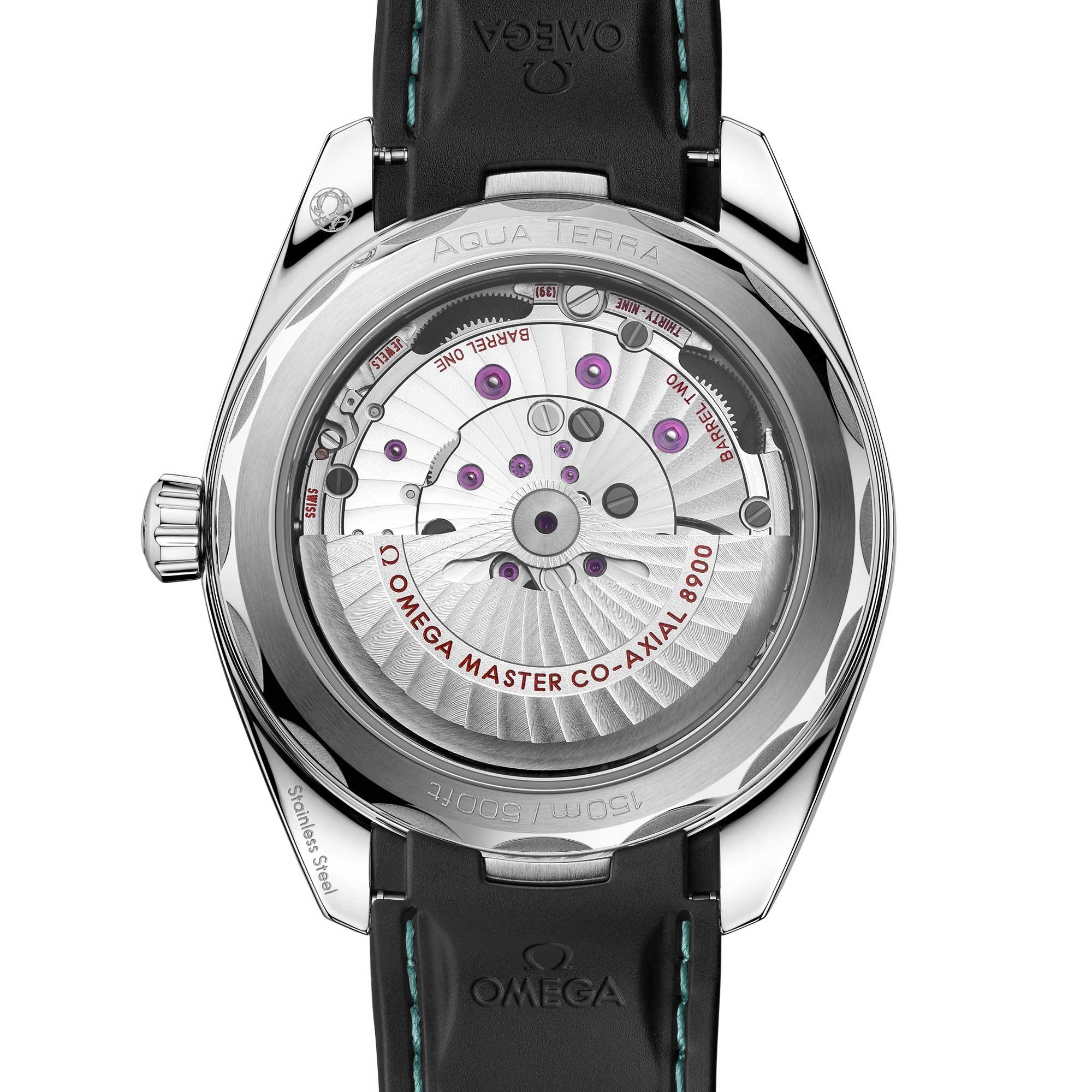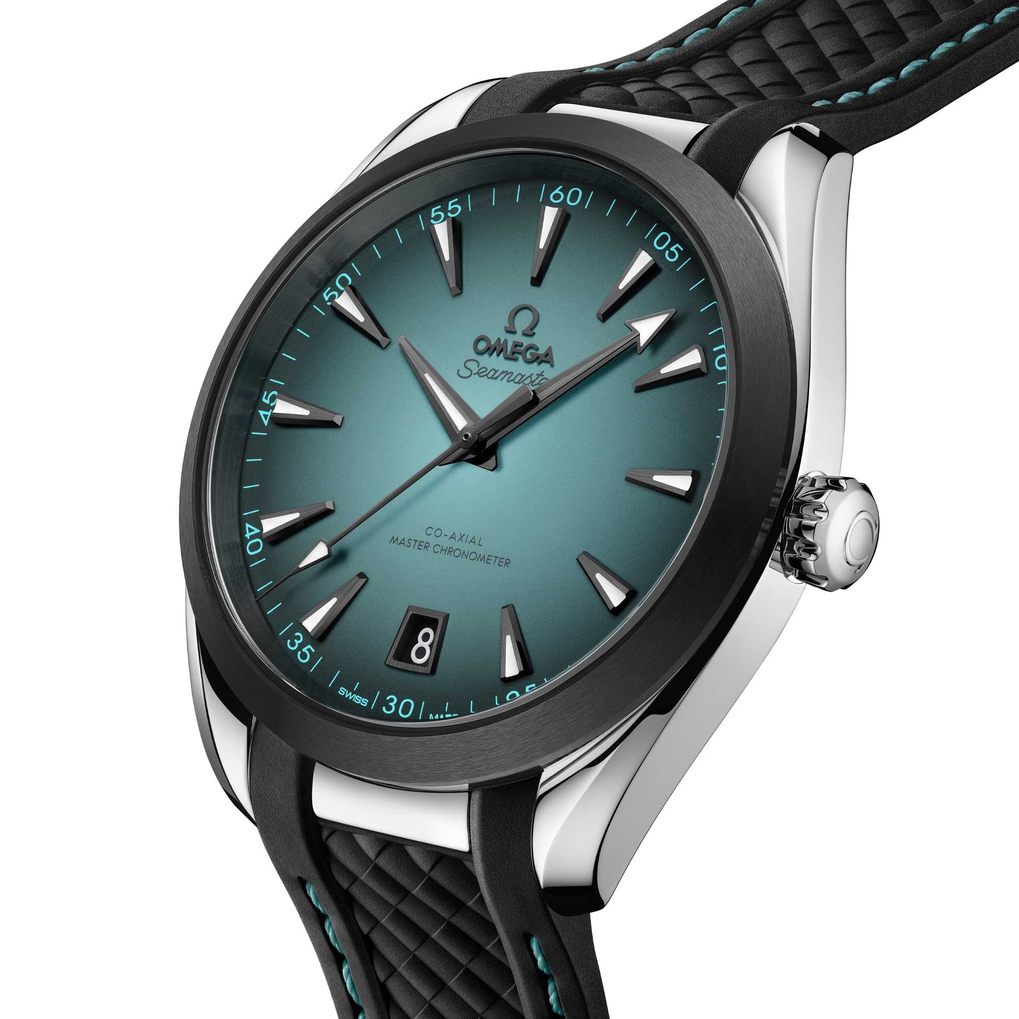 The Omega Seamaster Aqua Terra 41mm Watch 220.32.41.21.03.001 showcases a striking turquoise dial, finished with batons that provide clear readability. This automatic watch features a sophisticated analogue display with a date function, making it practical for daily wear.