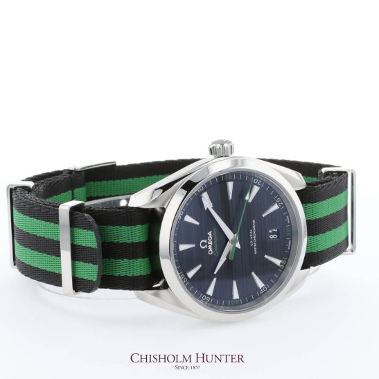 The watch is presented on a sporty green and black striped NATO strap. This certified chronometer is powered by the OMEGA Master Chronometer calibre 8900, certified at the industry’s highest standard by the Swiss Federal Institute of Metrology (METAS).