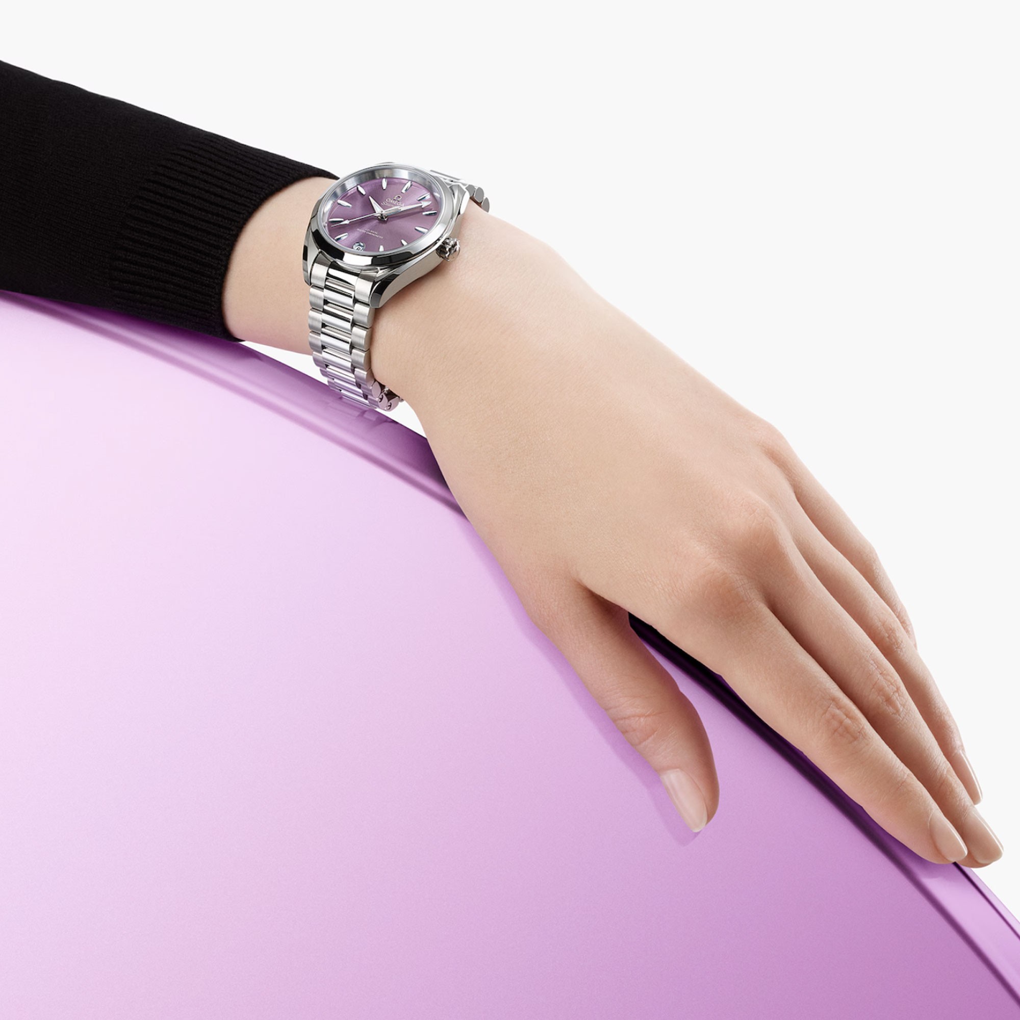 The lavender dial, fashioned from brass, is lacquered and sun-brushed from the centre. The date window at 6 o'clock, hands, indexes and OMEGA logo are in diamond-polished 18ct white gold. Presented on a polished and brushed bracelet, with beautifully rounded links, this classic Seamaster is powered by OMEGA’s Co-Axial Master Chronometer calibre 8800, certified at the industry’s highest standard by the Swiss Federal Institute of Metrology (METAS). Water resistant to 150m.