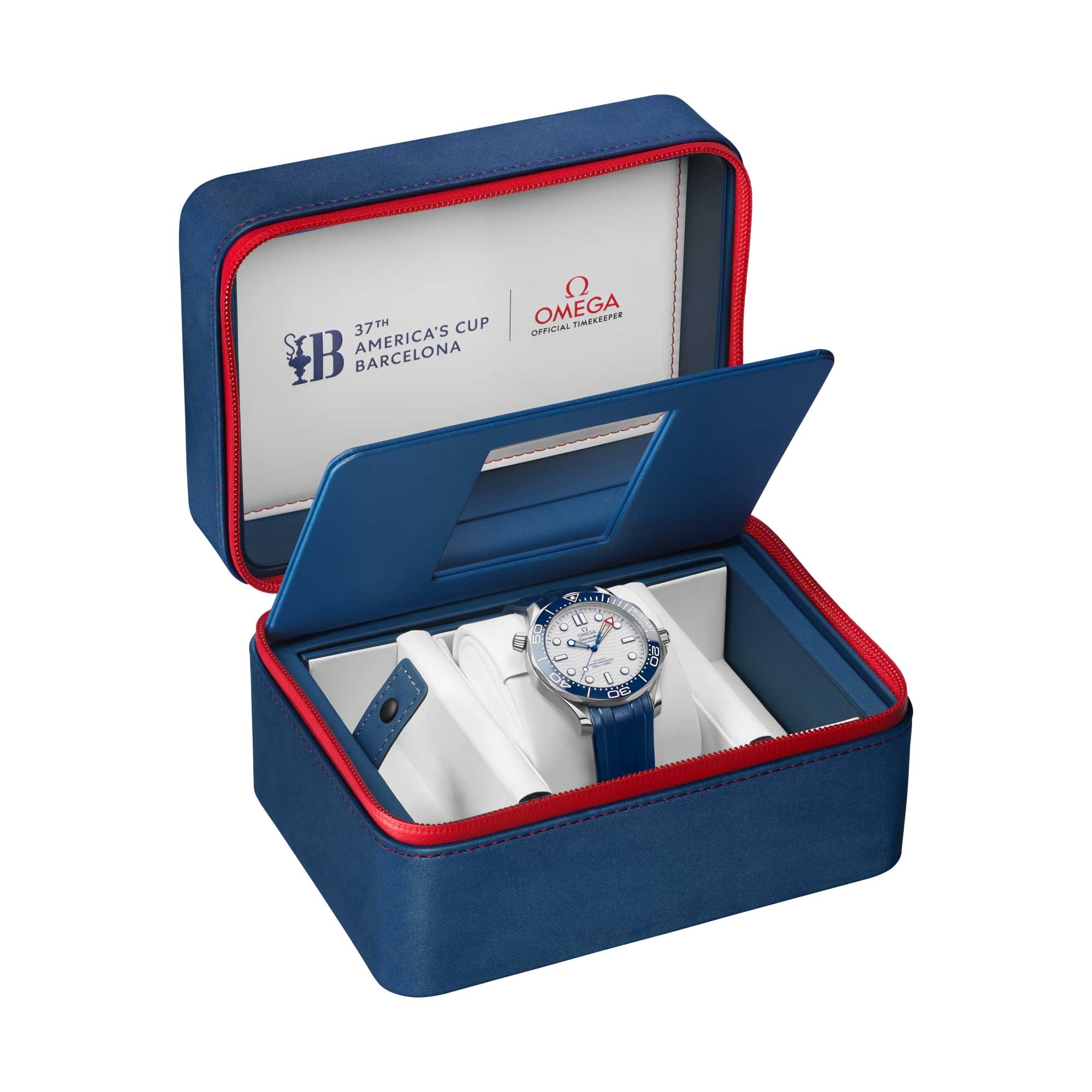 This model has a blue rubber strap with OMEGA’s patented Quick-Change system and is presented in a commemorative blue box with red stitching.