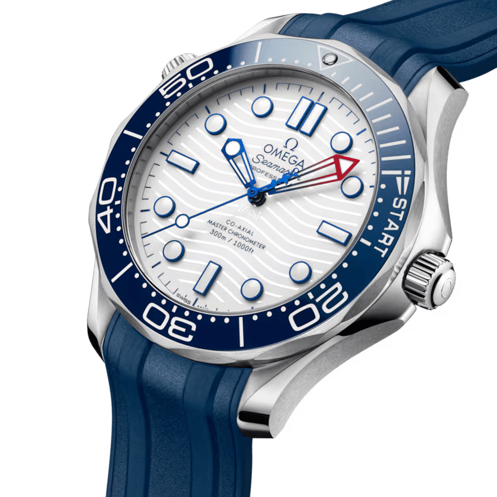 The 42 mm Seamaster Diver 300M in stainless steel has a blue ceramic unidirectional bezel with a regatta scale, comprised of two 5-minute pre-start sections, and START section with regatta-inspired flag.