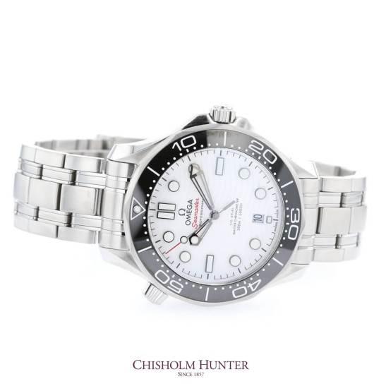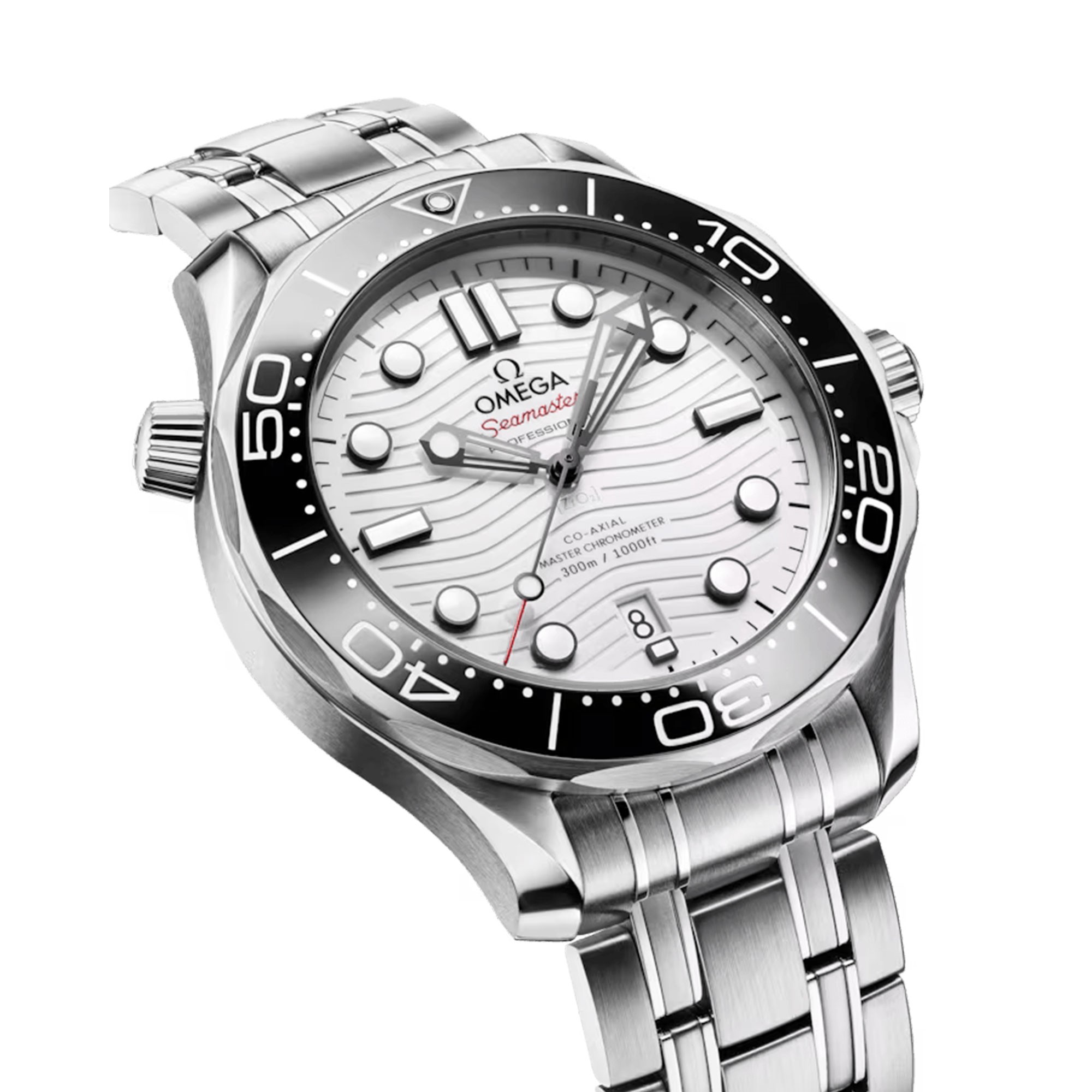The OMEGA Seamaster Professional Diver 300M has maintained its legendary following since 1993 and, today, still embraces the famous ocean heritage along with OMEGA's best innovation and design. This modest-sized 42mm stainless steel case model includes a black ceramic bezel with a white enamel diving scale. The dial is vibrant in white ceramic and features laser-engraved waves and Seamaster highlighted in red. The polished, blackened skeleton hour and minute hands are filled with white Super-LumiNova and the seconds hand features a varnished red tip. Well presented on a polished and brushed stainless steel bracelet, this watch is powered by the Swiss made OMEGA Master Chronometer Calibre 8800 movement. Water resistant to 300m.