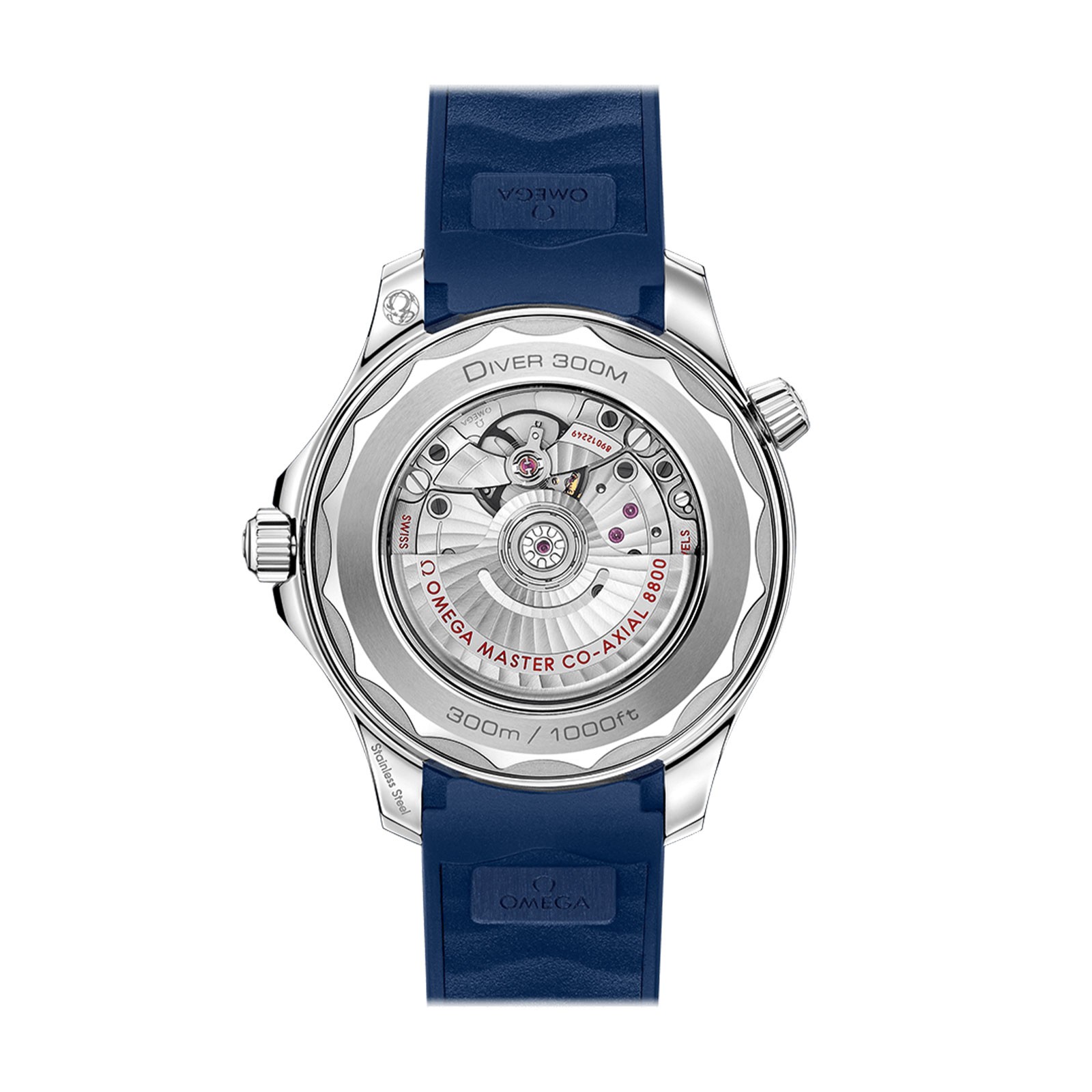 The watch is presented on a blue rubber strap and is driven by the OMEGA Master Chronometer Calibre 8800, which can be seen through the sapphire-crystal on the wave-edged caseback.