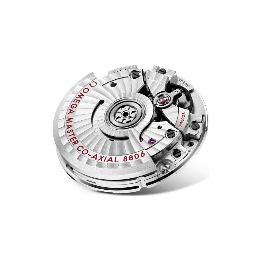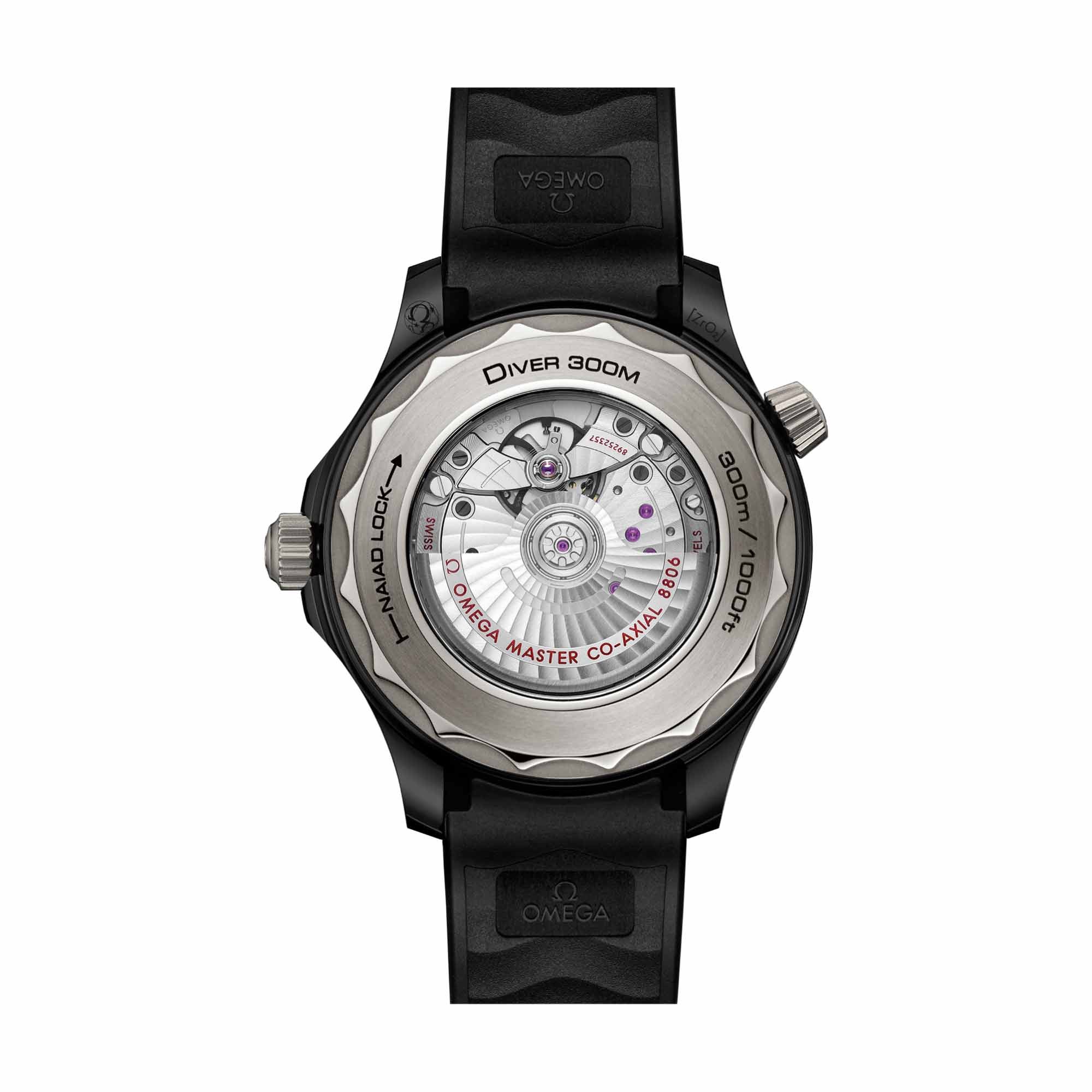 The watch is presented on an integrated black rubber strap with a polished-brushed black ceramic [ZrO2] buckle, and is driven by the OMEGA Master Chronometer Calibre 8806, which can be seen through the sapphire-crystal on the wave-edged caseback.