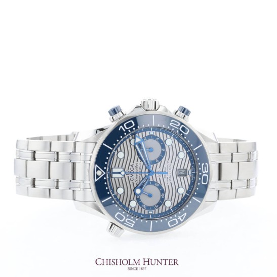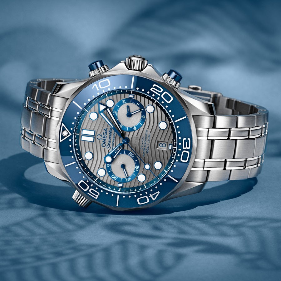 The OMEGA Seamaster Professional Diver 300M, since 1993, has enjoyed a legendary following. Embracing the famous ocean heritage, todays models have OMEGA's best innovation and design. Presented on a stainless steel bracelet, this 44mm chronograph model has a polished blue ceramic bezel with a white enamel diving scale. The eye-catching dial is sun-brushed PVD chrome colour ceramic and features laser-engraved waves with a date window positioned at 6 o'clock. The two sub-dial chronograph hands are blued, along with all other hands and indices which are filled with white Super-LumiNova. Powered by the Swiss made OMEGA Master Chronometer Calibre 9900 movement, this watch is water resistant to 300m.