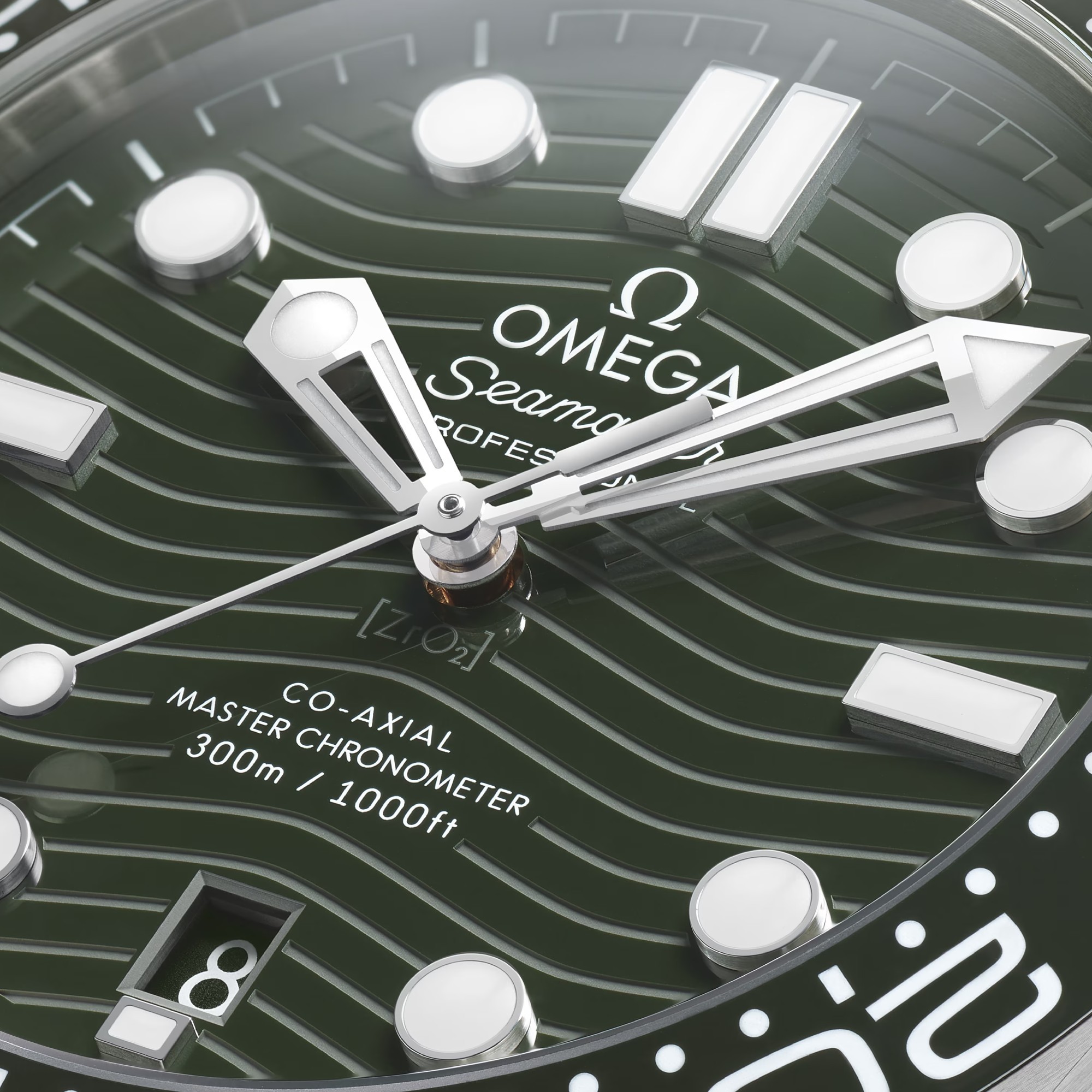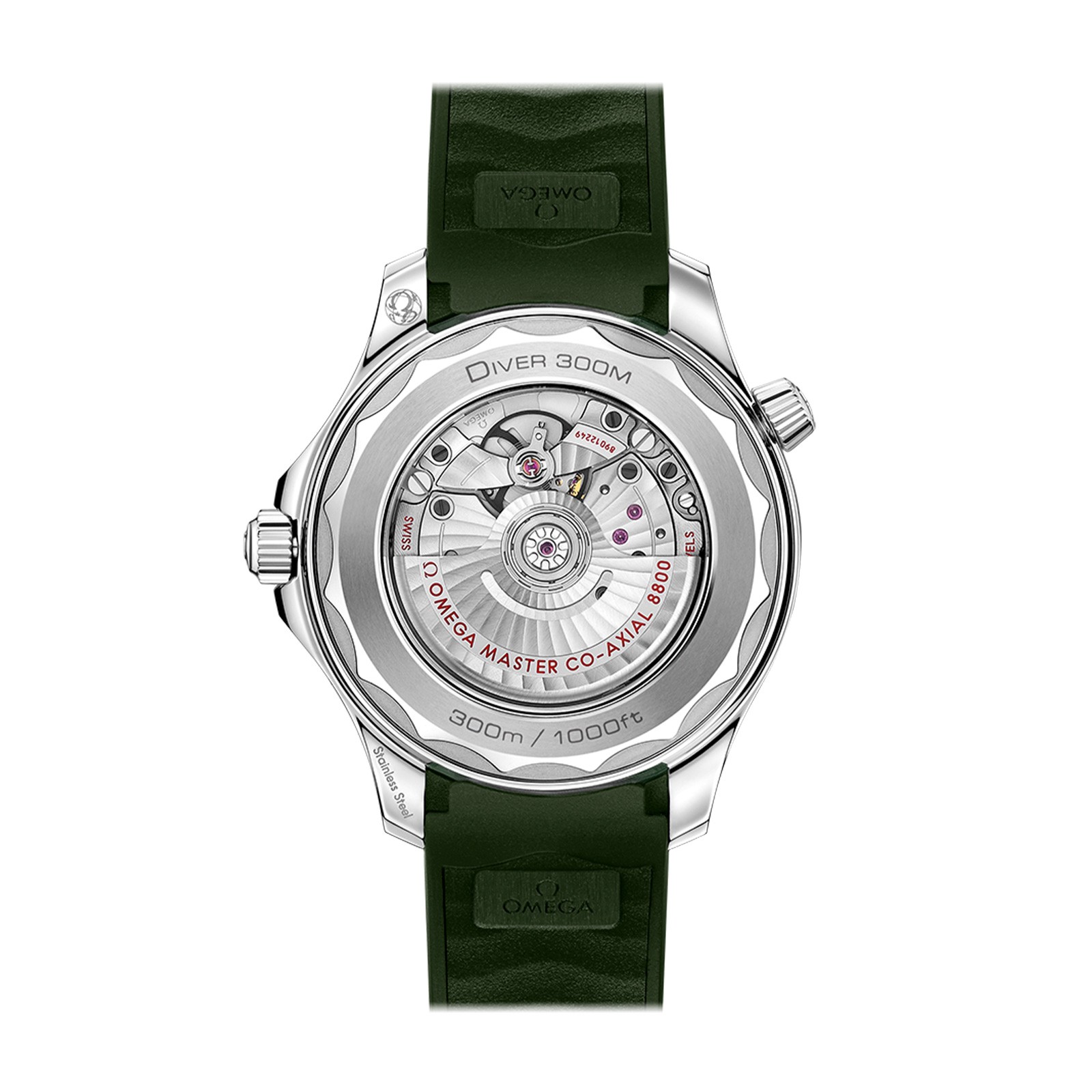 The watch is presented on a green rubber strap and is driven by the OMEGA Master Chronometer Calibre 8800, which can be seen through the sapphire-crystal on the wave-edged caseback.