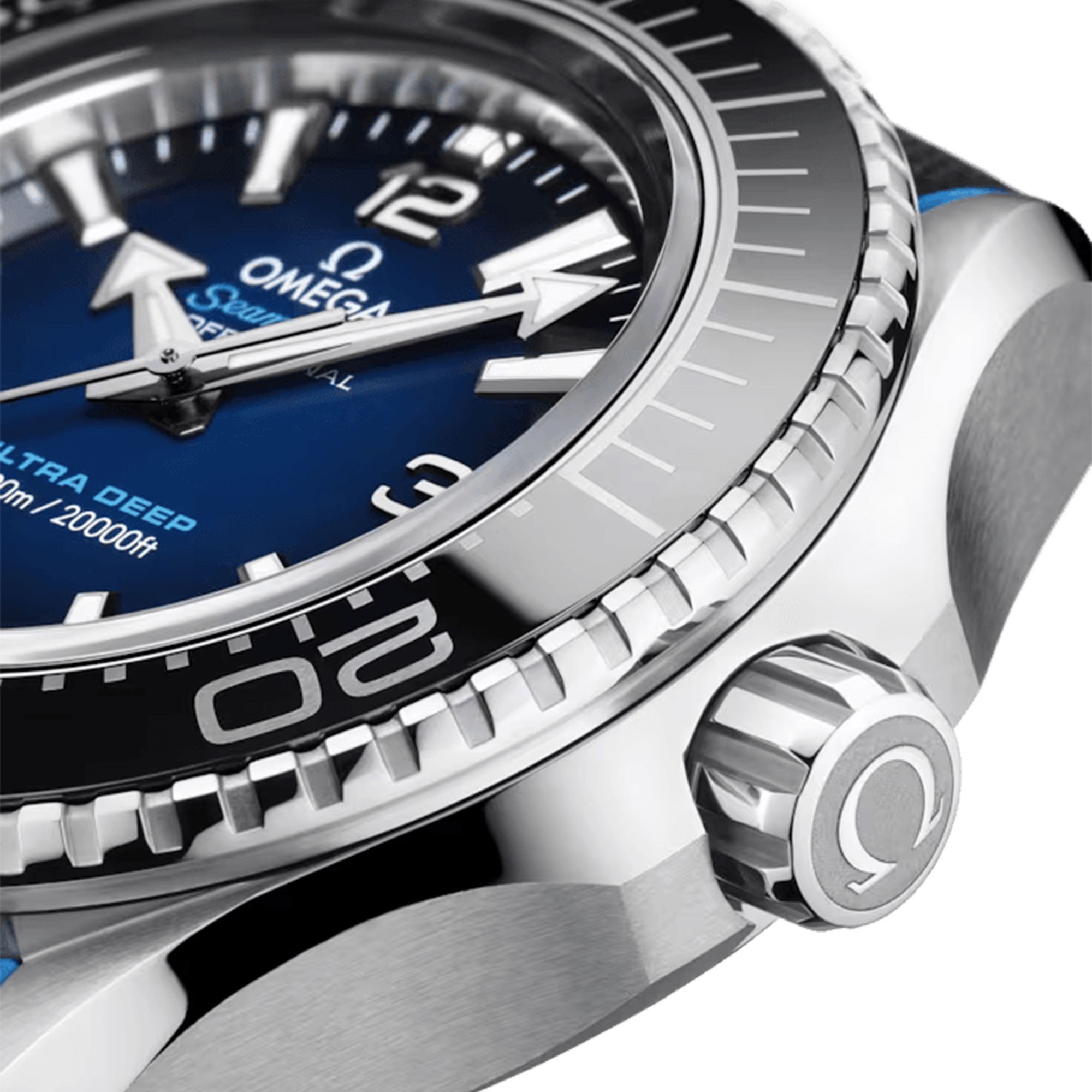 This 45.5 mm model in robust O-MEGASTEEL features a polished black ceramic bezel with its diving scale in Liquidmetalâ„¢. Through the protuberant and domed sapphire crystal, the lacquered gradient dial transitions from blue to black, and has been given 18K white gold hands and hour markers, which are all coated with white Super-LumiNova.