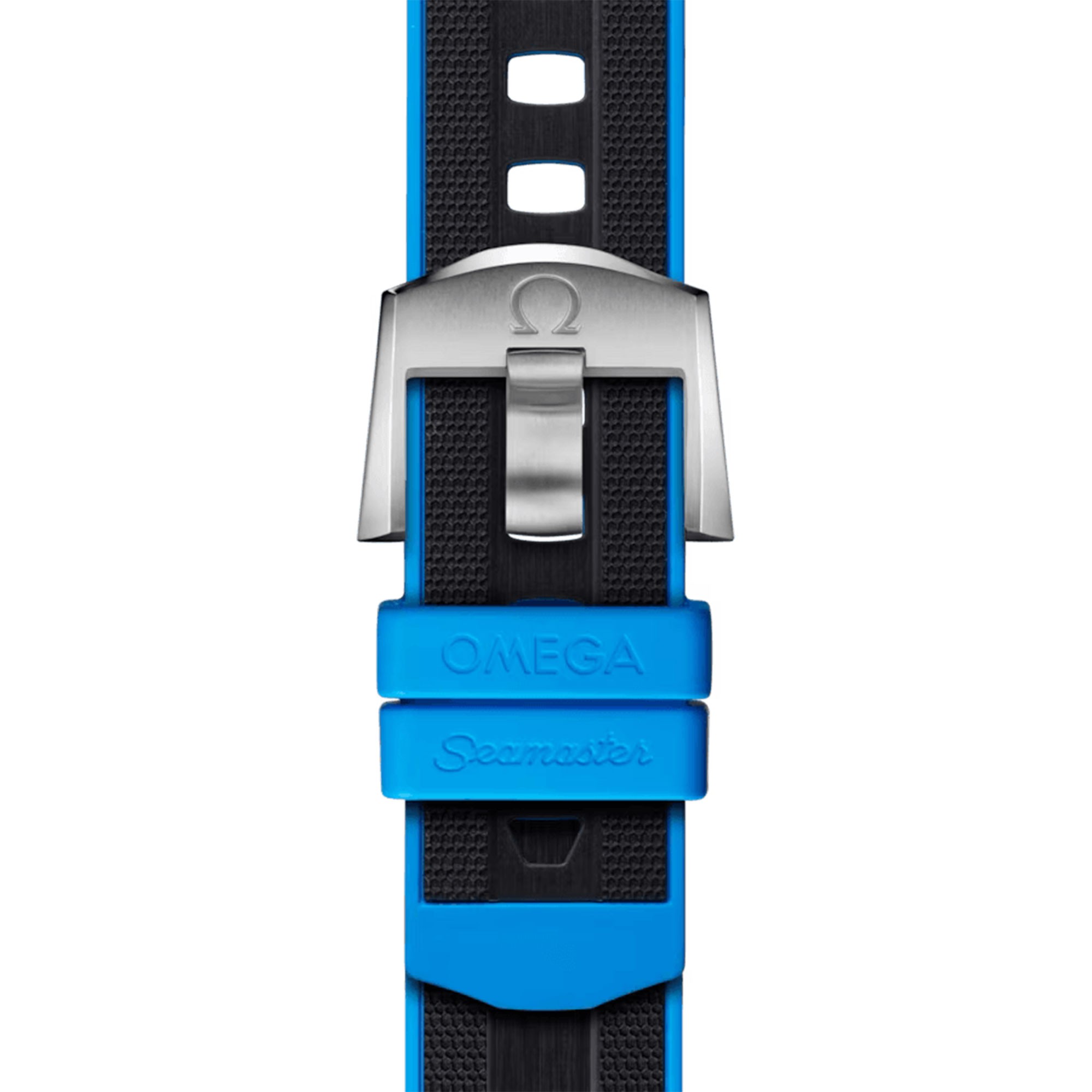The watch is set on a rubber strap with cyan lining and an O-MEGASTEEL buckle, while on the caseback's Grade 5 titanium medallion, there is a laser-engraved Sonar emblem with the iconic OMEGA Seahorse at its centre. Inside, the watch is driven by the OMEGA Co-Axial Master Chronometer Calibre 8912.