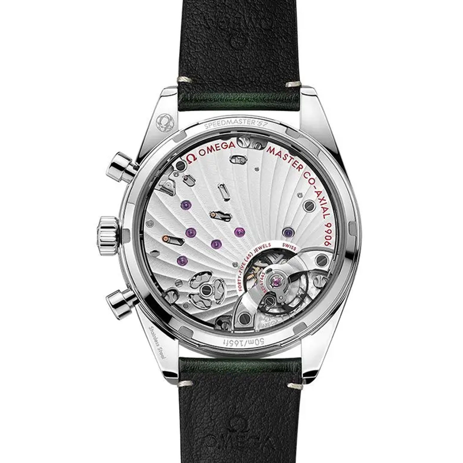 The watch is presented on a green leather strap with an OMEGA logo in postive relief on the buckle, and is driven by the manual-winding OMEGA Co-Axial Master Chronometer Calibre 9906.
