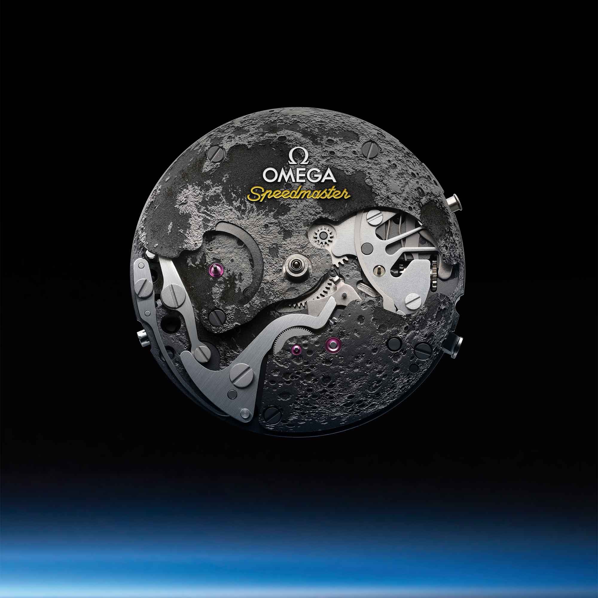 Manual-winding chronograph movement with Co-Axial escapement. Certified Master Chronometer, approved by METAS, resistant to magnetic fields reaching 15,000 gauss. Moon-relief textured and blackened on the main plate and bridges, with greater lunar detail compared to previous Calibre 1869 thanks to defined laser engraving and contrasting surfaces. Nickel coated wheels and black gold coated balance wheel. Free-sprung balance with silicon balance spring.