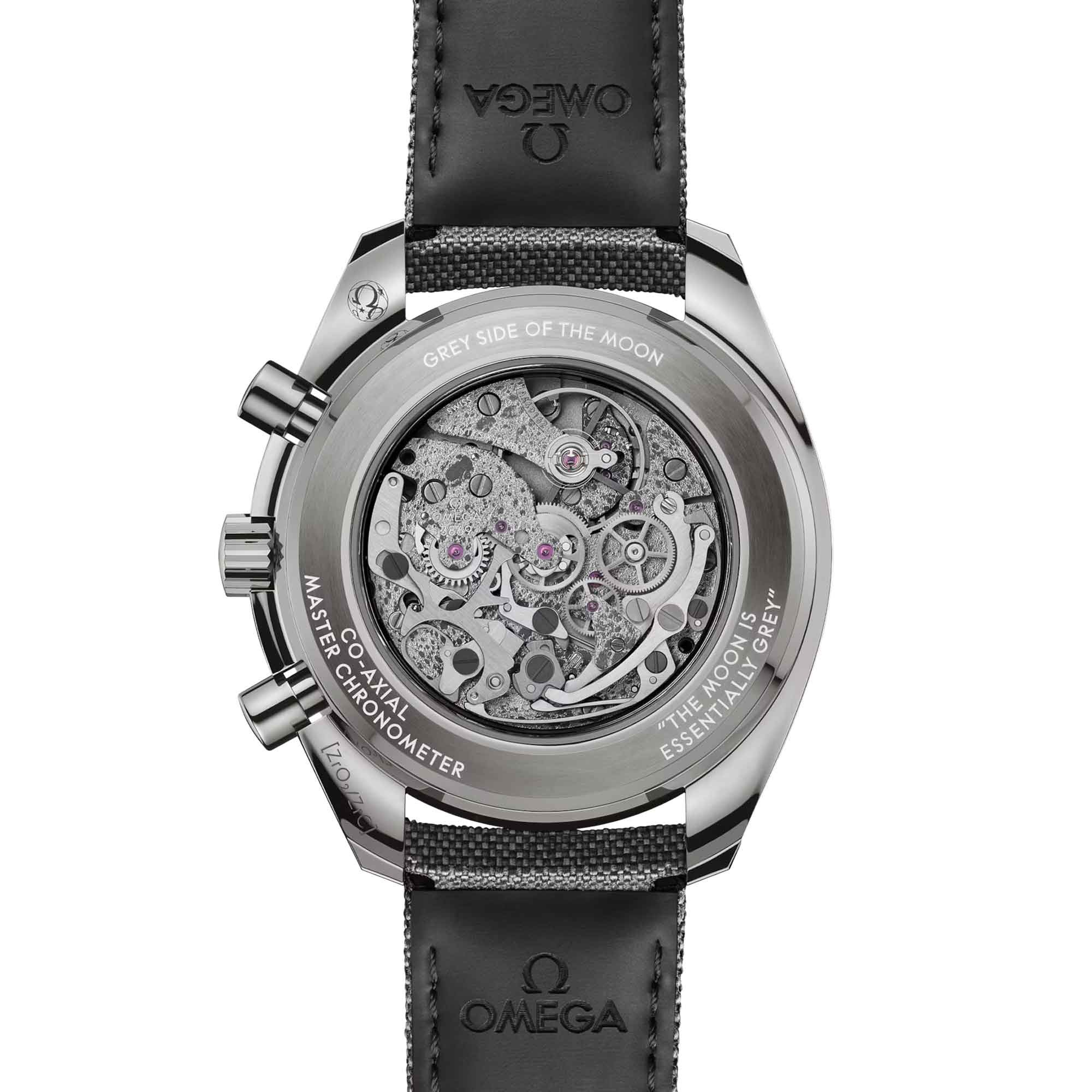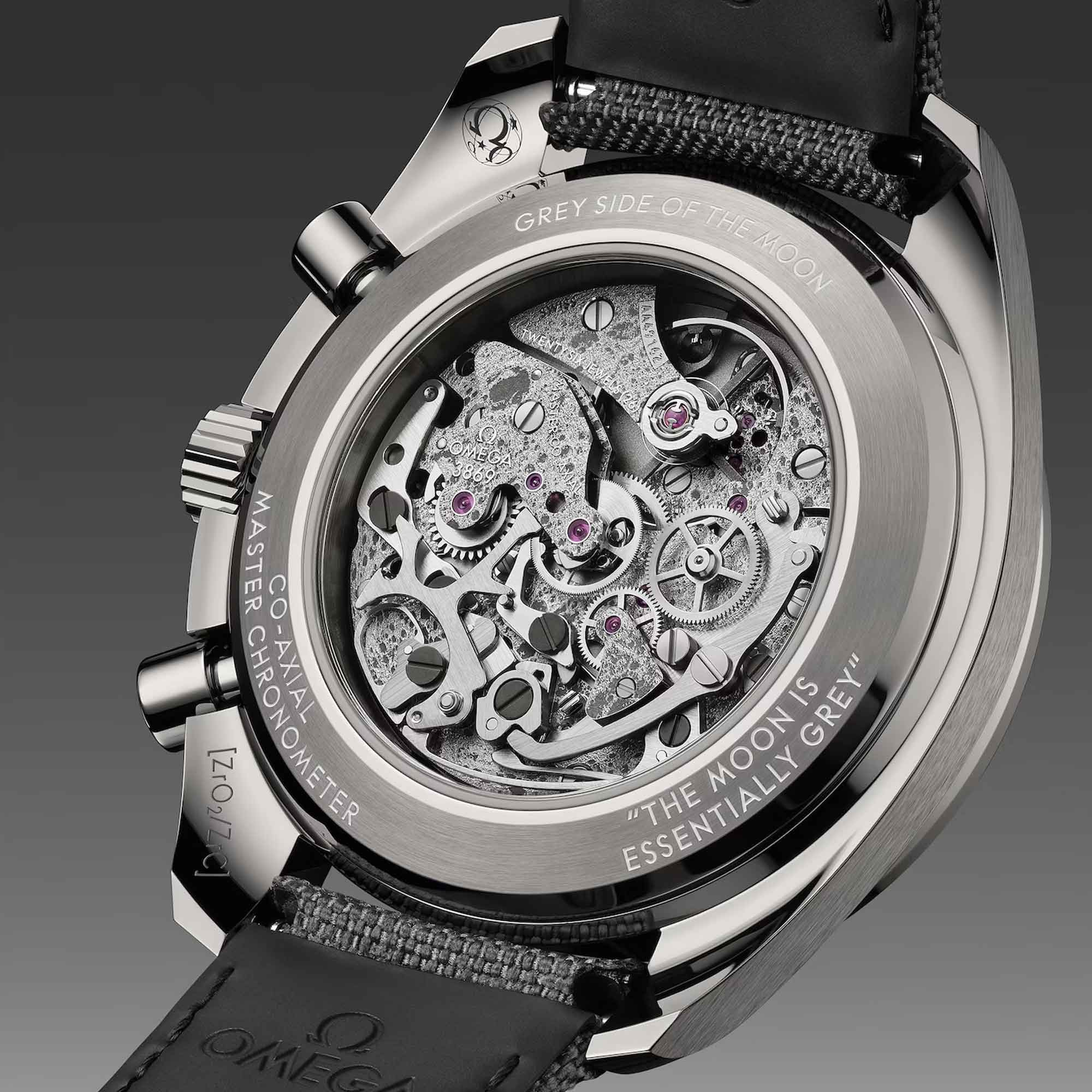 The specially decorated movement is the OMEGA Co-Axial Master Chronometer Calibre 3869, while the engravings on the caseback include the quote, THE MOON IS ESSENTIALLY GREY, which is attributed to Command Module Pilot, Jim Lovell, during the Apollo 8 mission.