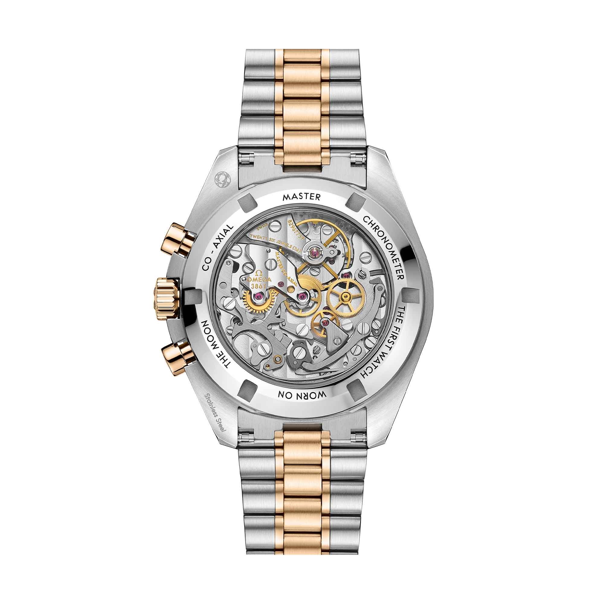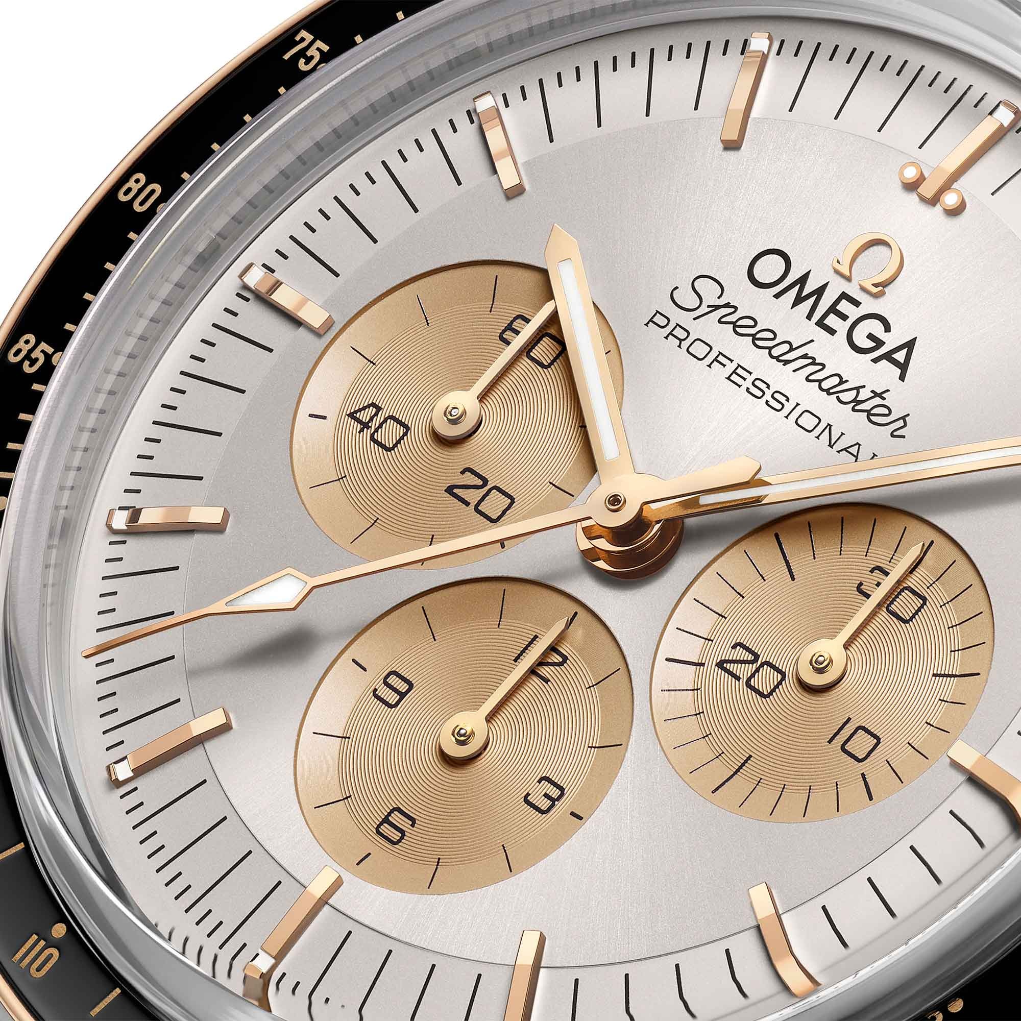 The sun-brushed silvery “step” dial is presented with applied OMEGA logo and indexes, 18K Moonshine™ Gold hands, and galvanic 18K Moonshine™ Gold subdials including a small seconds recorder, 30-minute recorder, and 12-hour recorder.