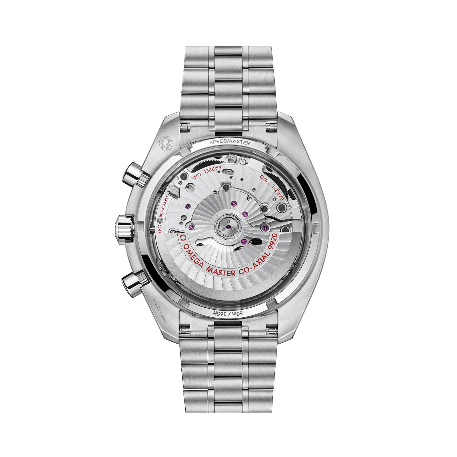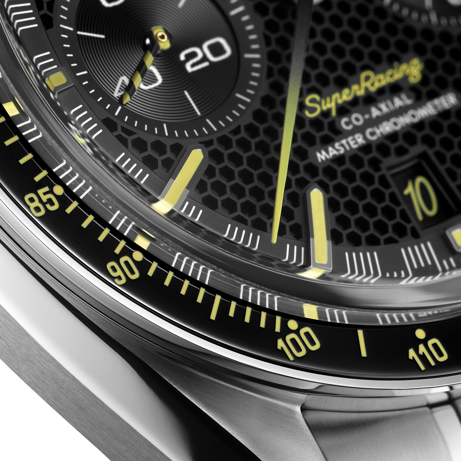 The first timepiece to include OMEGA’s fine-tune Spirate™ System is the Speedmaster Super Racing in stainless steel. A visual tribute to OMEGA’s 2013 anti-magnetic masterpiece which offers a clear view of the new mechanism through the sapphire crystal case-back. The diamond-polished and bevelled black arrowhead indexes are filled with a new and exclusive Super-LumiNova which emits a surprising yellow glow. This colour code extends to the Speedmaster and Super Racing wording on the dial.At 6 o’clock there’s a stylish and regular reminder of the >15’000 GAUSS 10 year anniversary: a “10” in Speedmaster logo font, which appears once a month in the watch’s date window.The new Speedmaster Super Racing includes a sporty alternative to the steel bracelet. A NATO strap in recycled nylon with black and yellow stripes, referencing the distinctive colour code of the Seamaster Aqua Terra >15’000 GAUSSlaunched exactly 10 years ago.