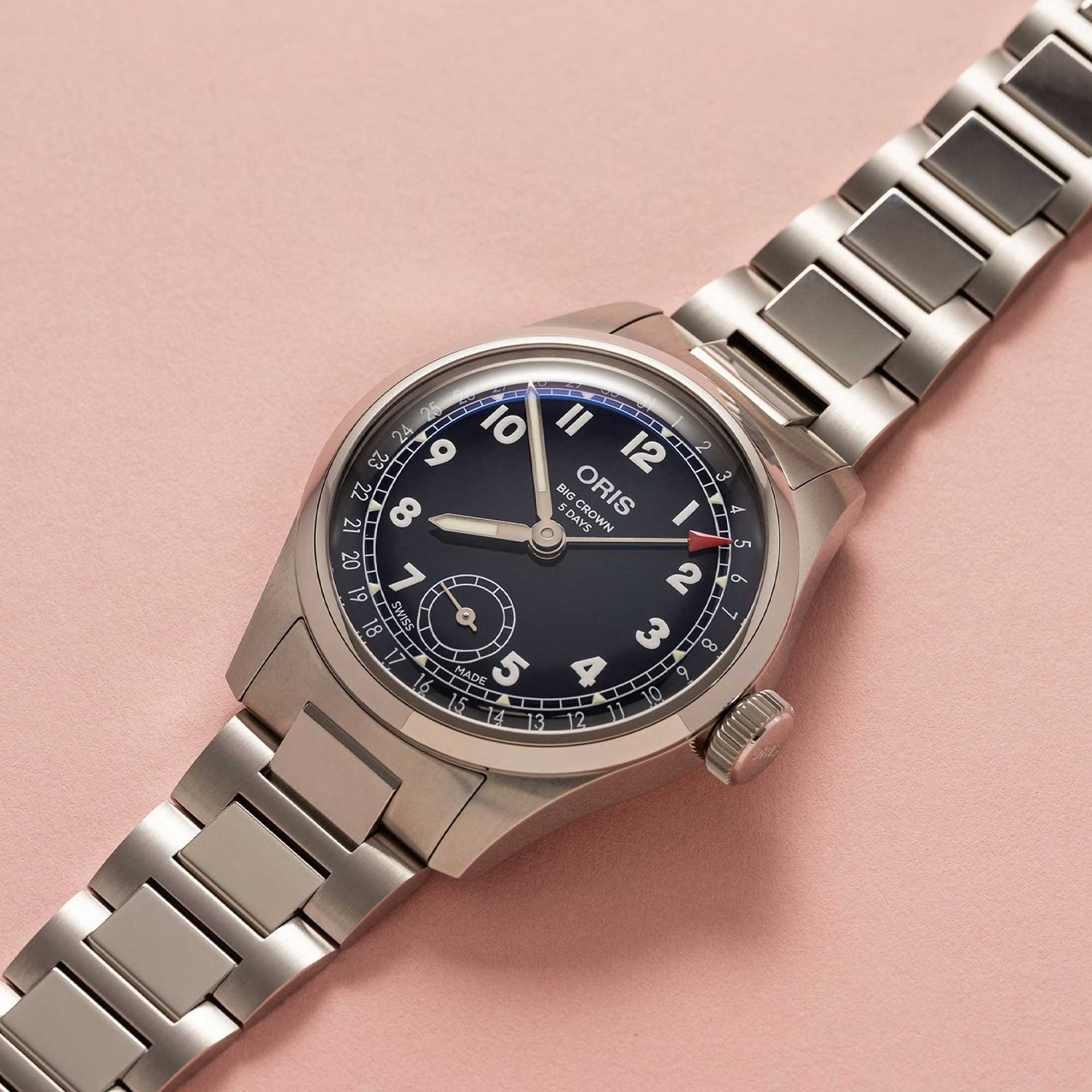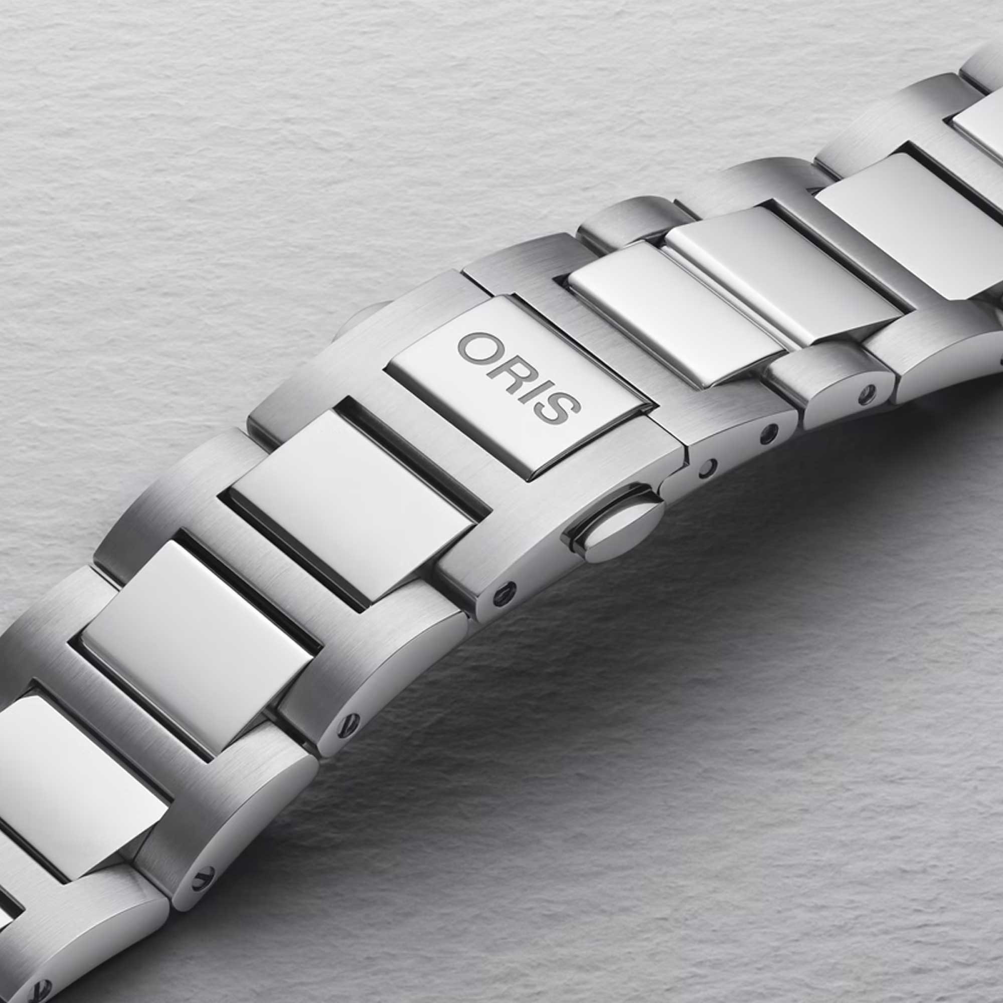 The Big Crown Pointer Date at 38.00 mm is one of our most versatile designs. Featuring our iconic Pointer Date function and dressed with a midnight blue dial, it now also comes on an H-link metal bracelet with an ergonomic Oris-developed clasp.