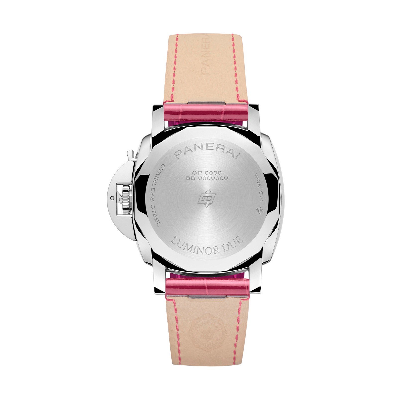 PANERAI watches are a natural blend of Swiss technology, Italian design, and passion for the sea. The designs were modern-looking with minimal lines. The LUMINOR DUE collection is the essence of Panerai, an iconic, simple, and strong design with an unmistakable identity. The dial is ivory sun-brushed with luminous Arabic numerals and hour markers. This stylish watch includes a moon phase feature at 3 o'clock and a small seconds subdial at 9 o'clock, with a striking strap in pink alligator leather with tone-on-tone stitching, 20.0/18.0 standard size width. Discover this fascinating luxury watch brand at Chisholm Hunter today.